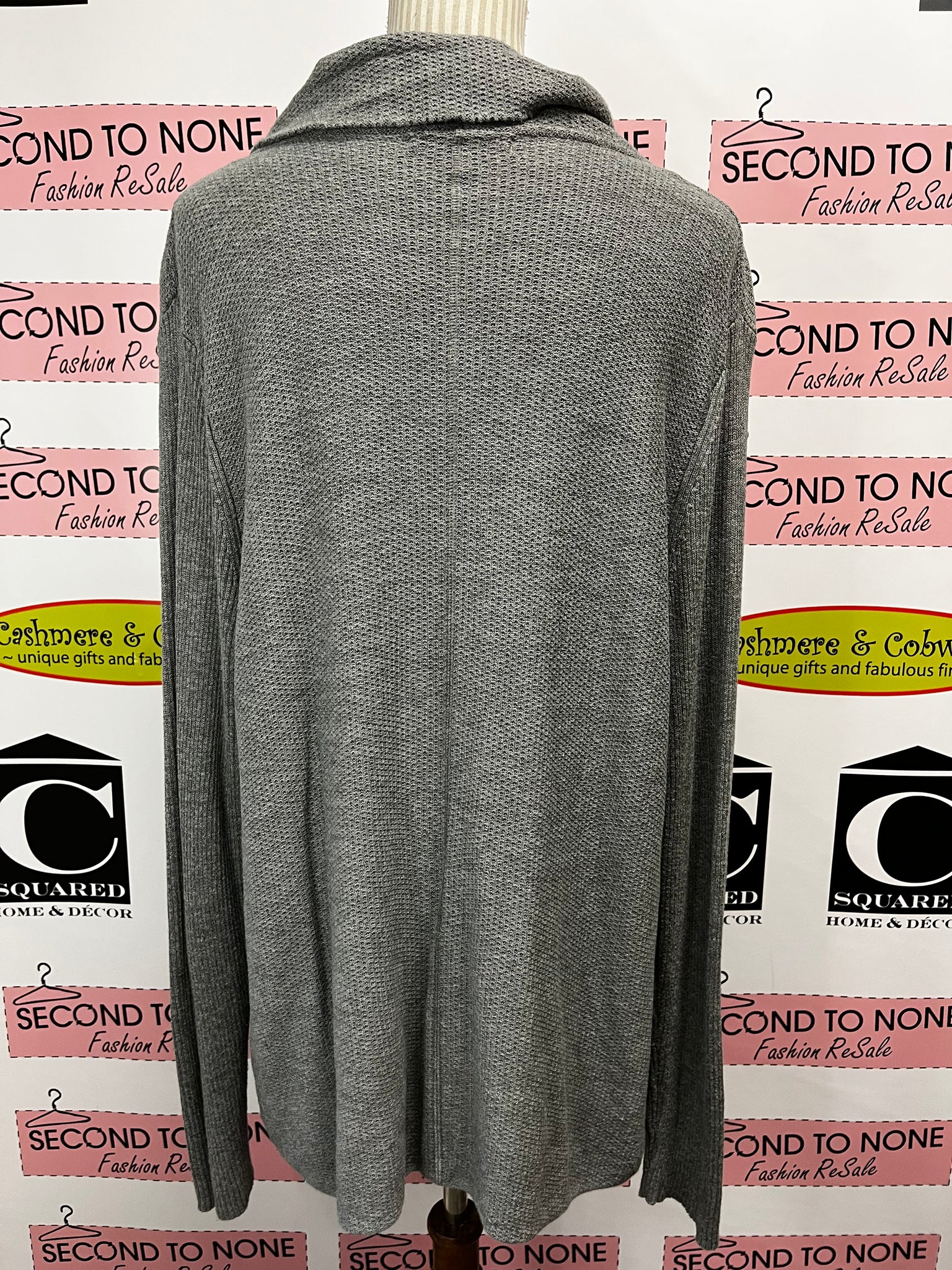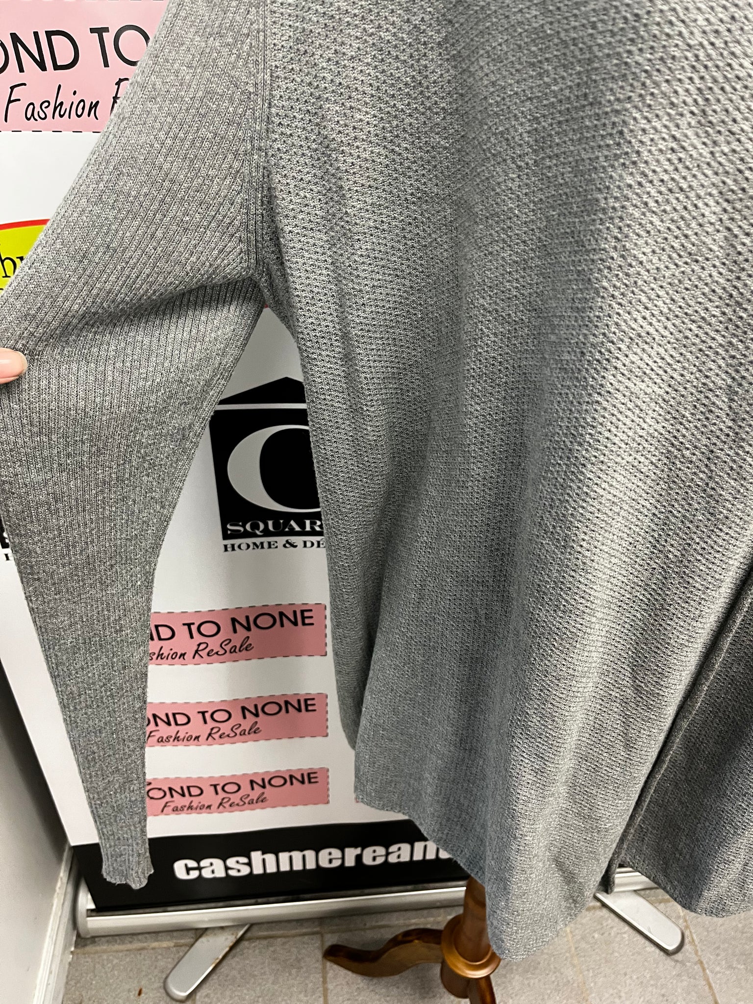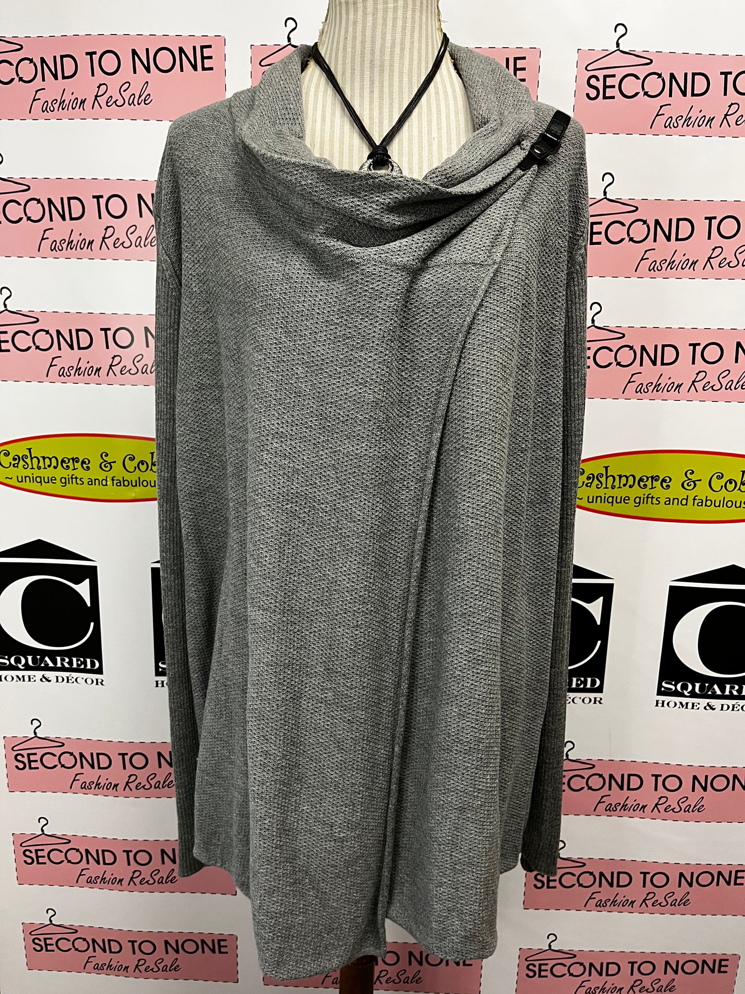 This light grey waffle weave cardigan from Alfred Sung is both versatile and stylish. With a draped front that can also be buckled to create a wrap top, this cardigan is perfect for any occasion. The long sleeves provide extra warmth and comfort. Dress it up or down for a chic and cozy look.