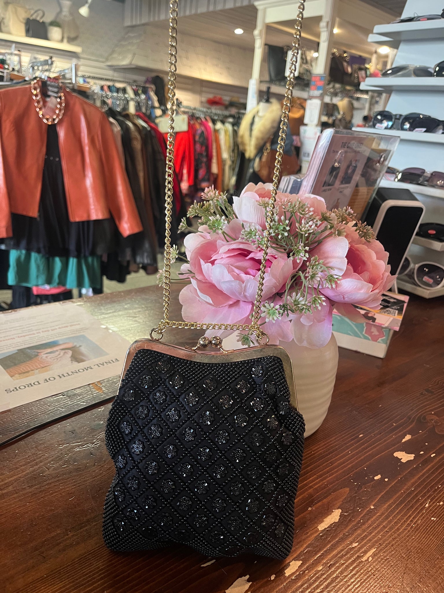 This hand-crafted evening bag is a stunning addition to any outfit. The intricate beading and gold hardware catch the light beautifully, while the satin interior keeps your essentials secure. With a versatile gold chain strap, this vintage-inspired bag can be worn on the shoulder or carried in hand. Its kiss-lock closure adds a touch of retro elegance. The perfect accessory for any occasion.