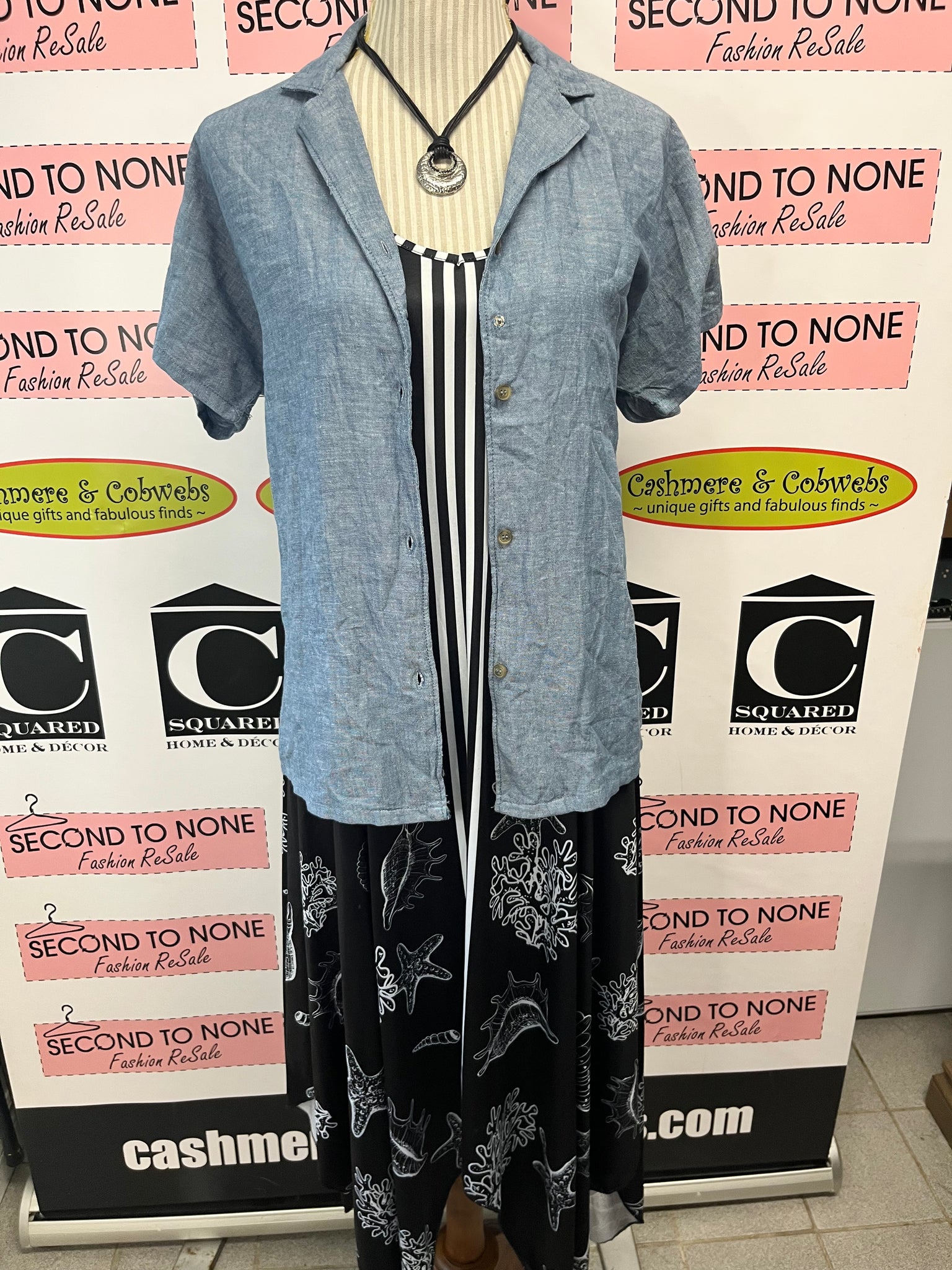 Dive into summer fun with this playful sleeveless dress from India Boutique. Featuring charming coral reef ocean icons in crisp white, sprinkled with sparkly details that catch the sun’s glow. The jagged shark bite hemline adds a cheeky edge, while four bold stripes run down the center for a splash of style. Perfect for carefree days and warm evenings, this one-size dress brings ocean vibes to your wardrobe with a lively twist.