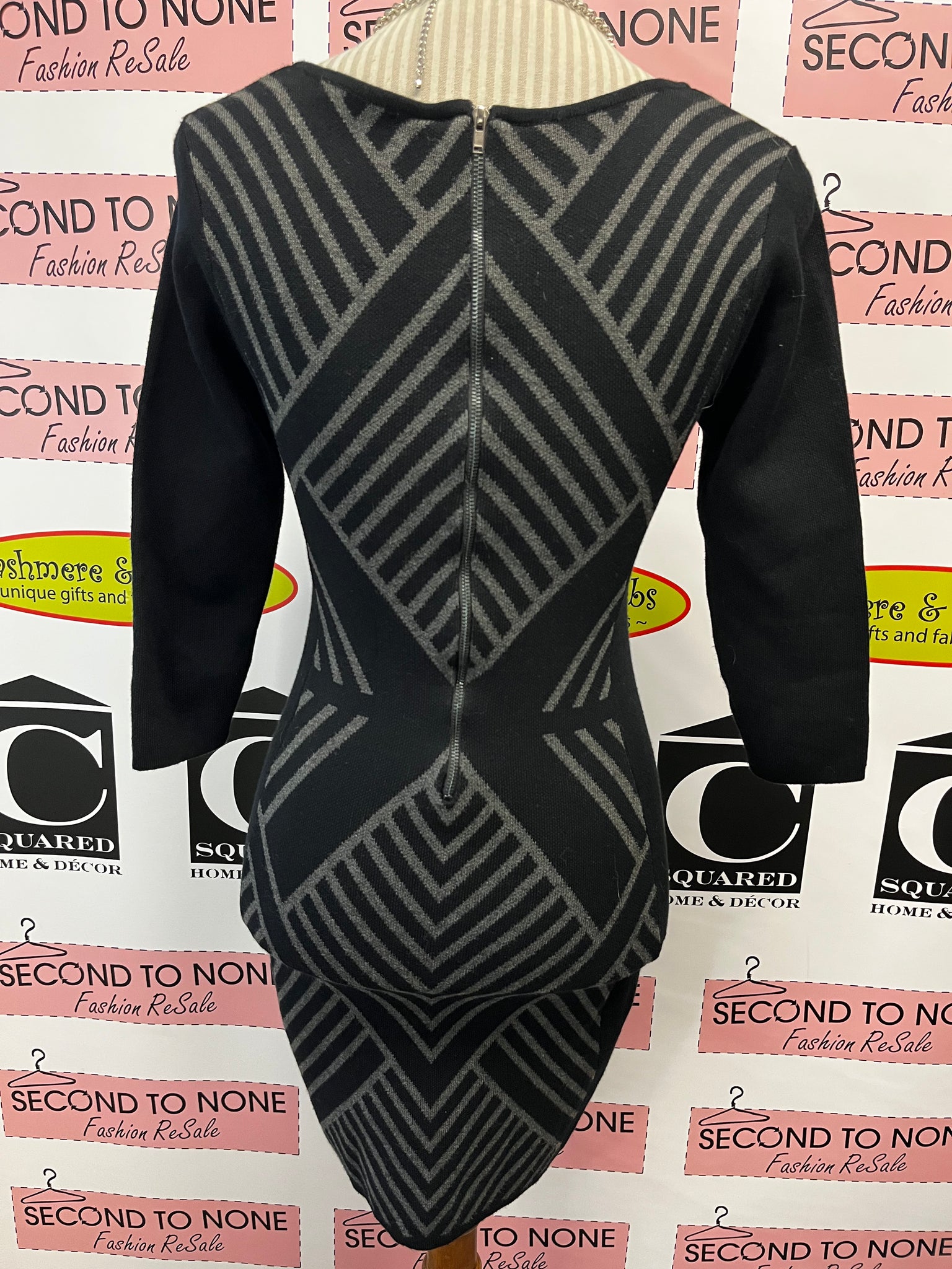 This Dex Bodycon Dress in chic black and grey hugs your curves with a flattering fit designed to turn heads. Its cozy sweater-like fabric keeps you comfy while the 3/4 sleeves add a stylish touch. Perfect for dressing up or down, this playful piece brings warmth and sass to any outfit. Size XS for a sleek silhouette that’s ready to party or lounge in style.