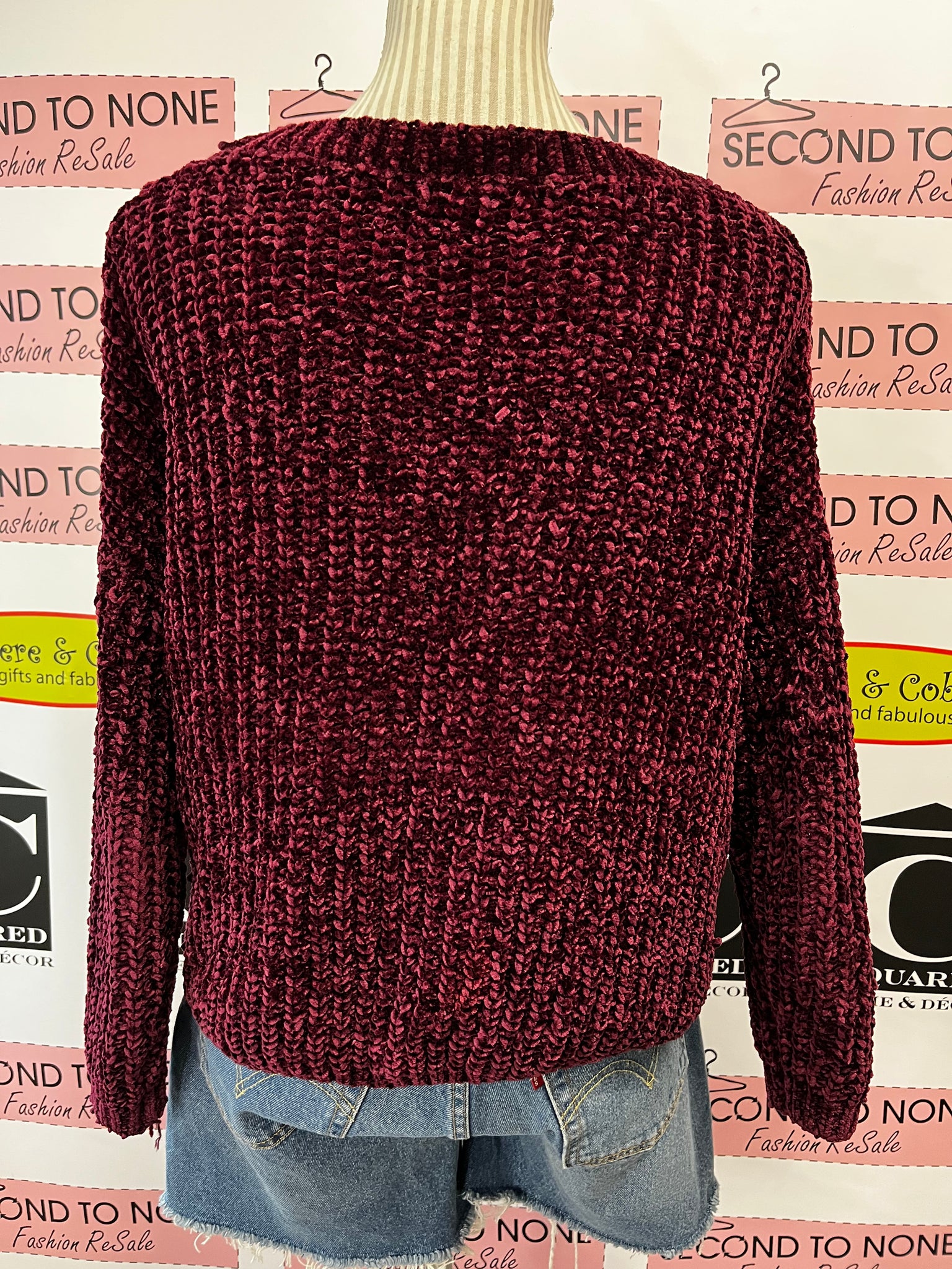This burgundy chenille knit sweater from Dex combines cozy softness with a fun, cropped fit perfect for layering. Its rounded neckline adds a touch of casual charm, making it an effortlessly stylish choice for chilly days when comfort meets playfulness.