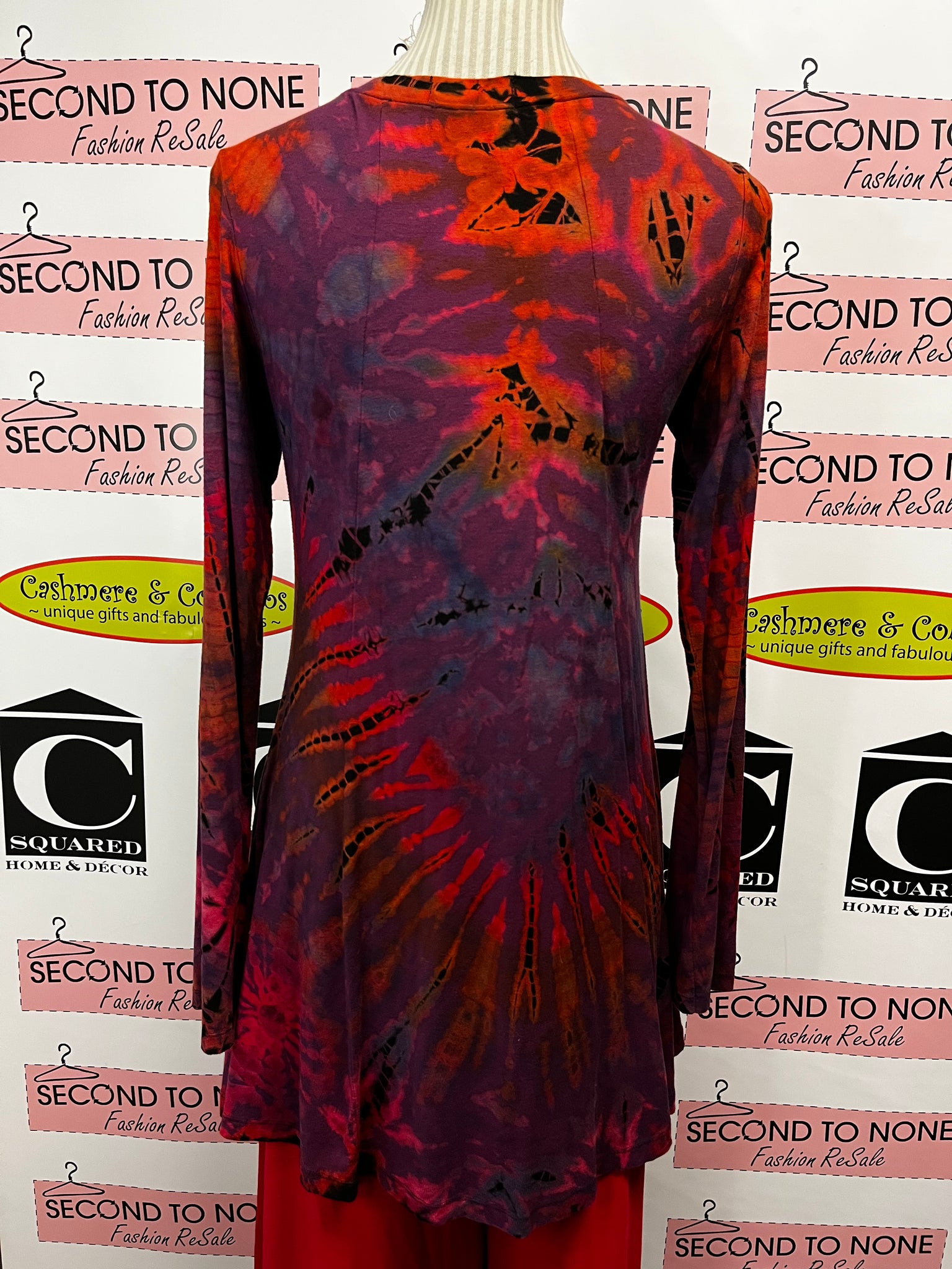 Get ready to groove in this stylish tie dye tunic top. Featuring a unique dark jewel tone design in shades of purple, orange, black, and brown, this top will surely make a statement. The rounded neckline and flowy draping to the hemline add an edgy touch to this groovy piece. Available in size S/M.