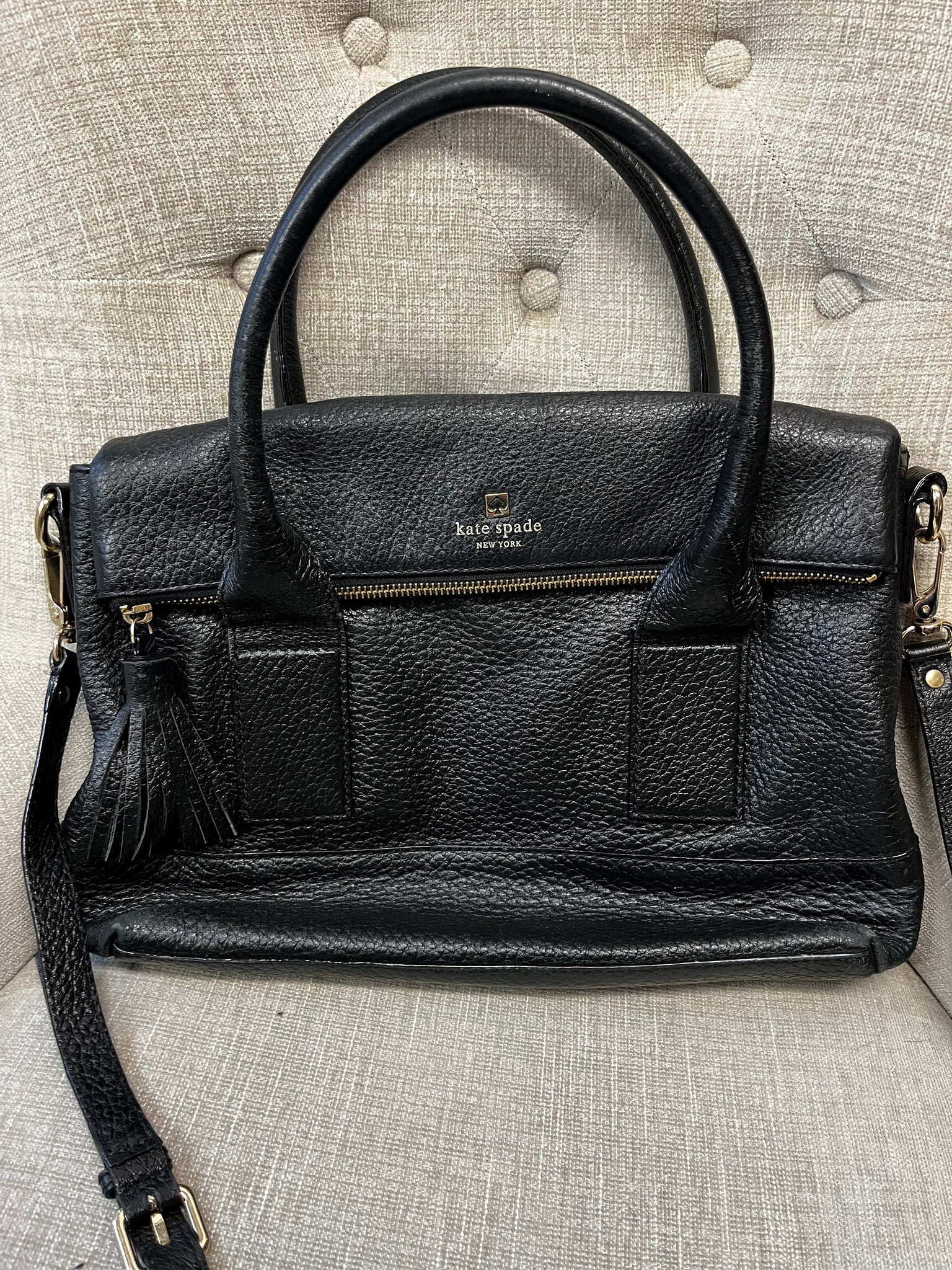 This chic Kate Spade handbag mixes classic black cow leather with a playful black and white striped interior. Its fold-over top keeps your essentials secure, while the adjustable crossbody strap lets you rock it hands-free from work to weekend. Stylish, practical, and ready to up your accessory game in a snap!