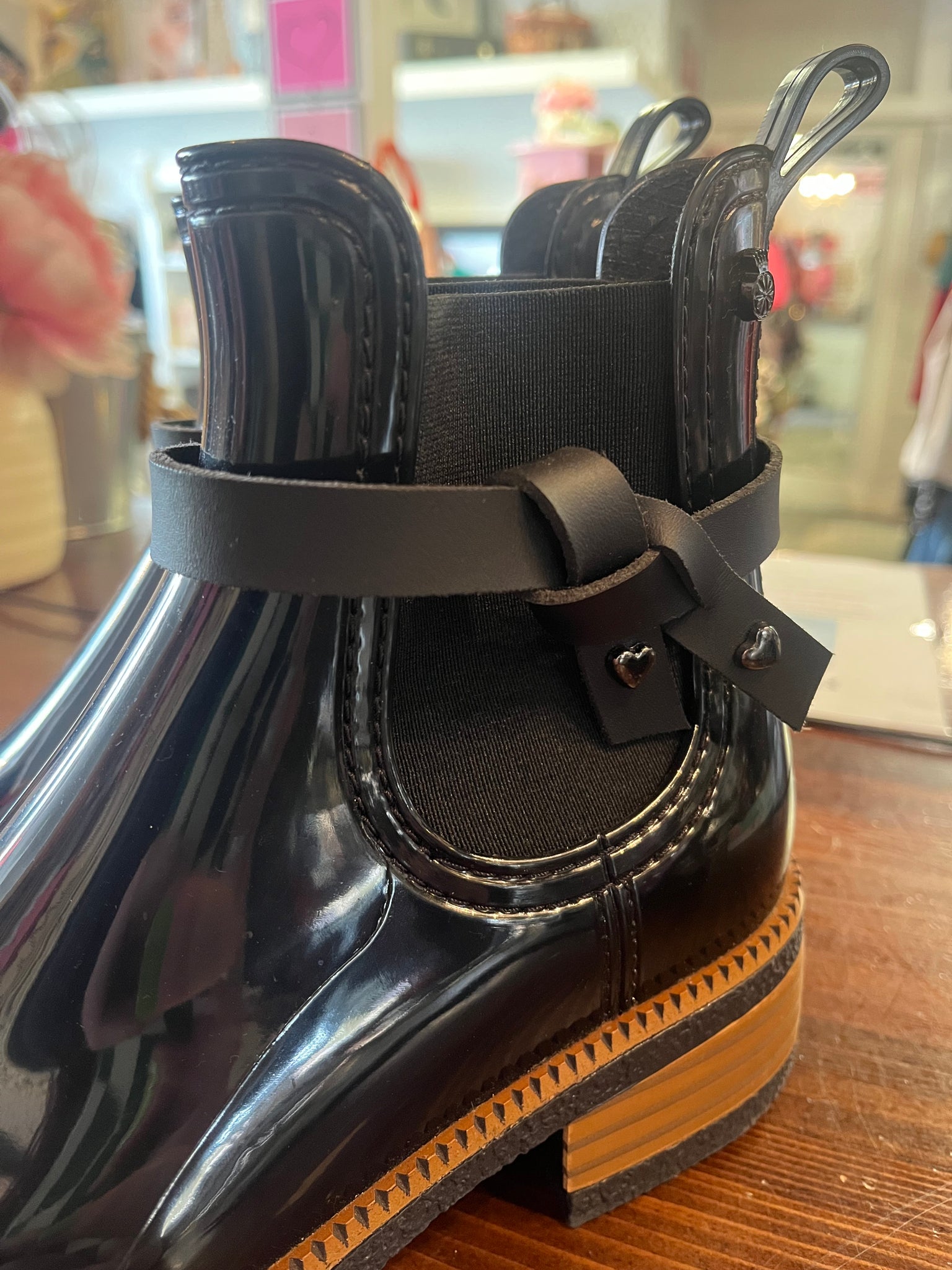 Meet your new rainy-day essential: these gorgeous Lemon Jelly glossy black boots that practically put themselves on. The stretchy side panel means zero fussing—just slip your feet in and you're good to go. Playful decorative straps bring personality to the sleek design, while a modest heel adds just enough lift to keep things interesting. Topped off with charming brown accents framing the sole, these boots deliver style without the drama. Gently loved and in nearly perfect condition, they're ready for their next adventure.