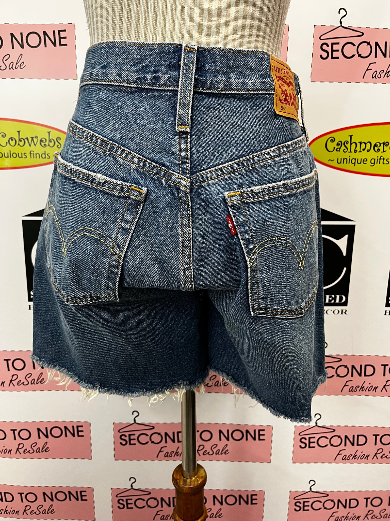 Upgrade your wardrobe with this staple item, Levi’s 501 Denim Shorts. These medium wash shorts feature a distressed look, raw hem, and a button fly. With the classic red tag and laid-back style, these will be your go to summer shorts. Elevate your look with these must-have shorts! Size 27.