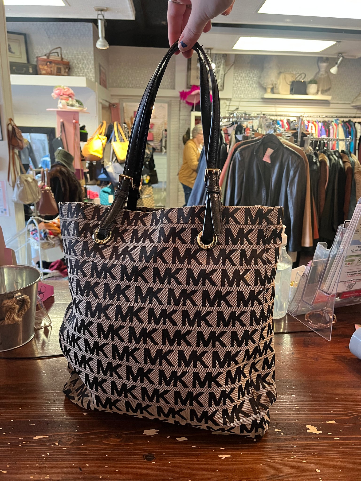 Effortlessly stylish and functional, the Michael Kors Jet Set Tote Bag features a unique brown and black MK initial design. The adjustable buckle straps and gold logo grommet details add an edgy touch. Stay organized with the interior zippered pocket and 3 bucket pockets. No clasp, just an open top for easy access.