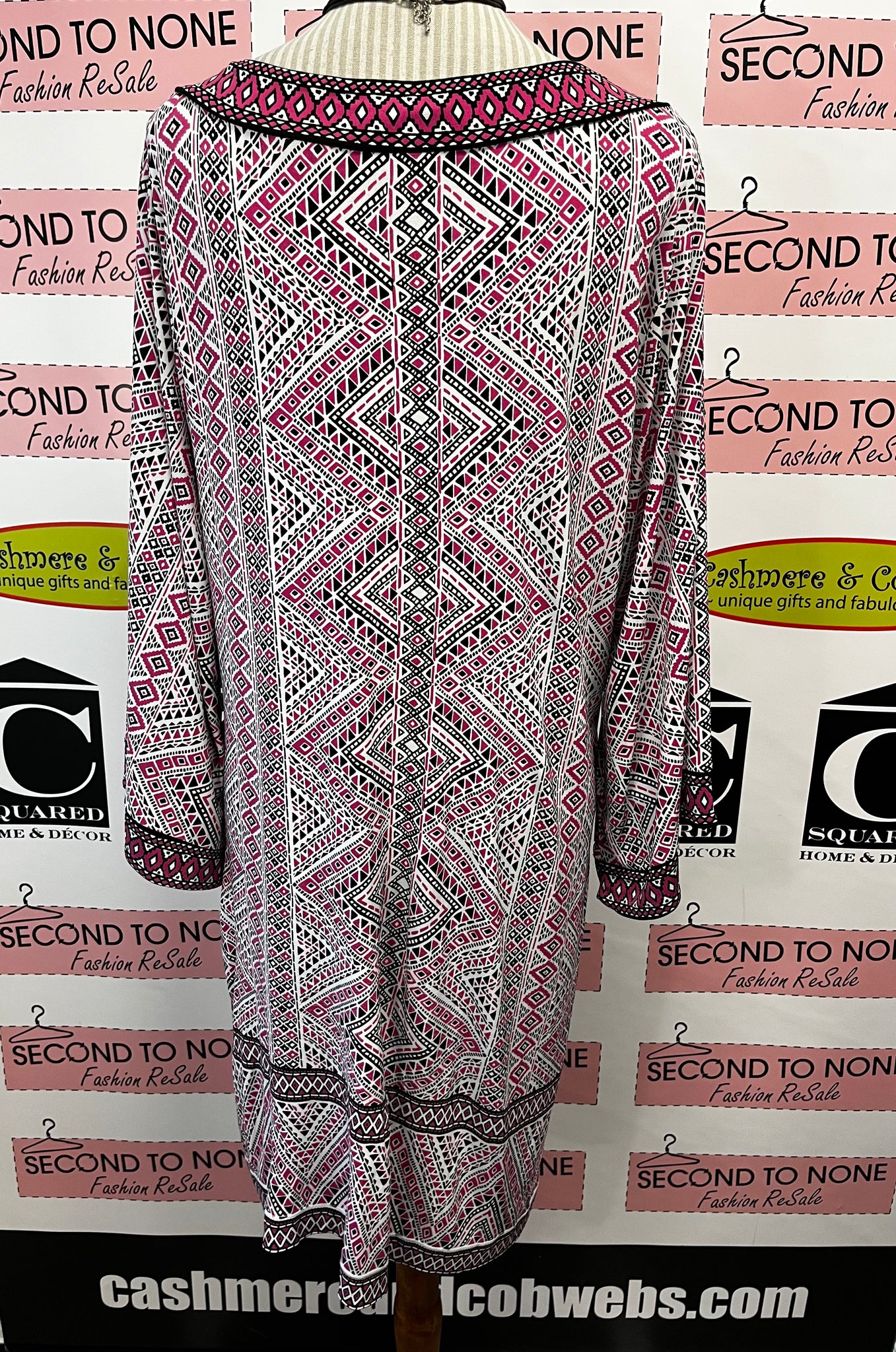 Bring fun flair to your wardrobe with this Michael Kors dress in lively pink, black, and white print. Its wide sleeves and stretchy fabric create an effortlessly comfortable fit, while the playful cutout at the neckline adds a cheeky surprise. Perfect for turning heads with a mix of bold style and easygoing charm.