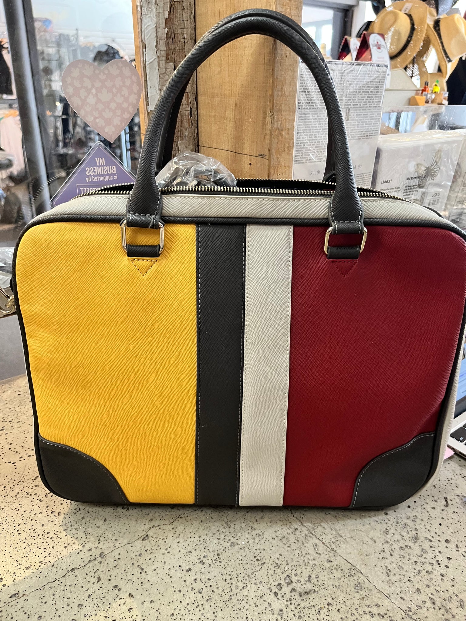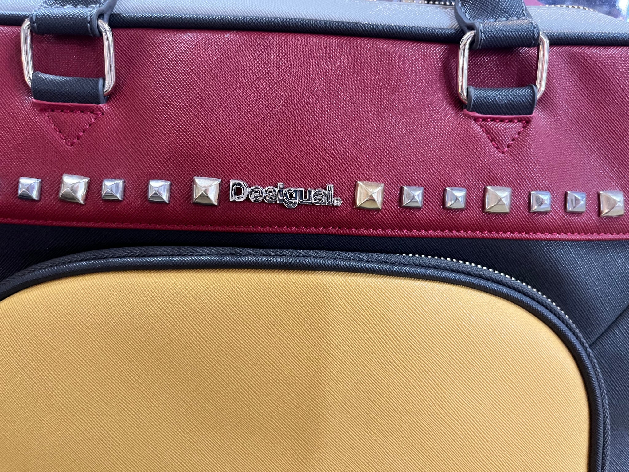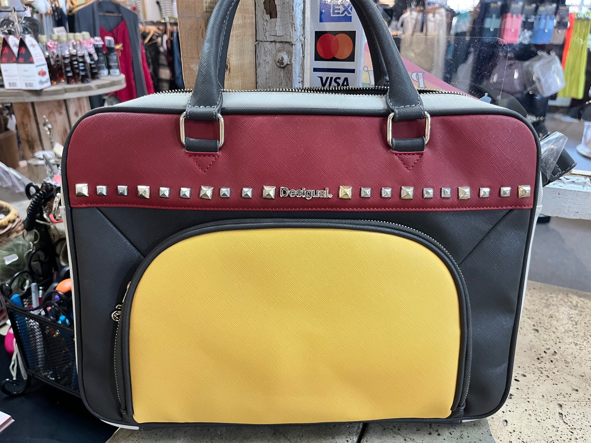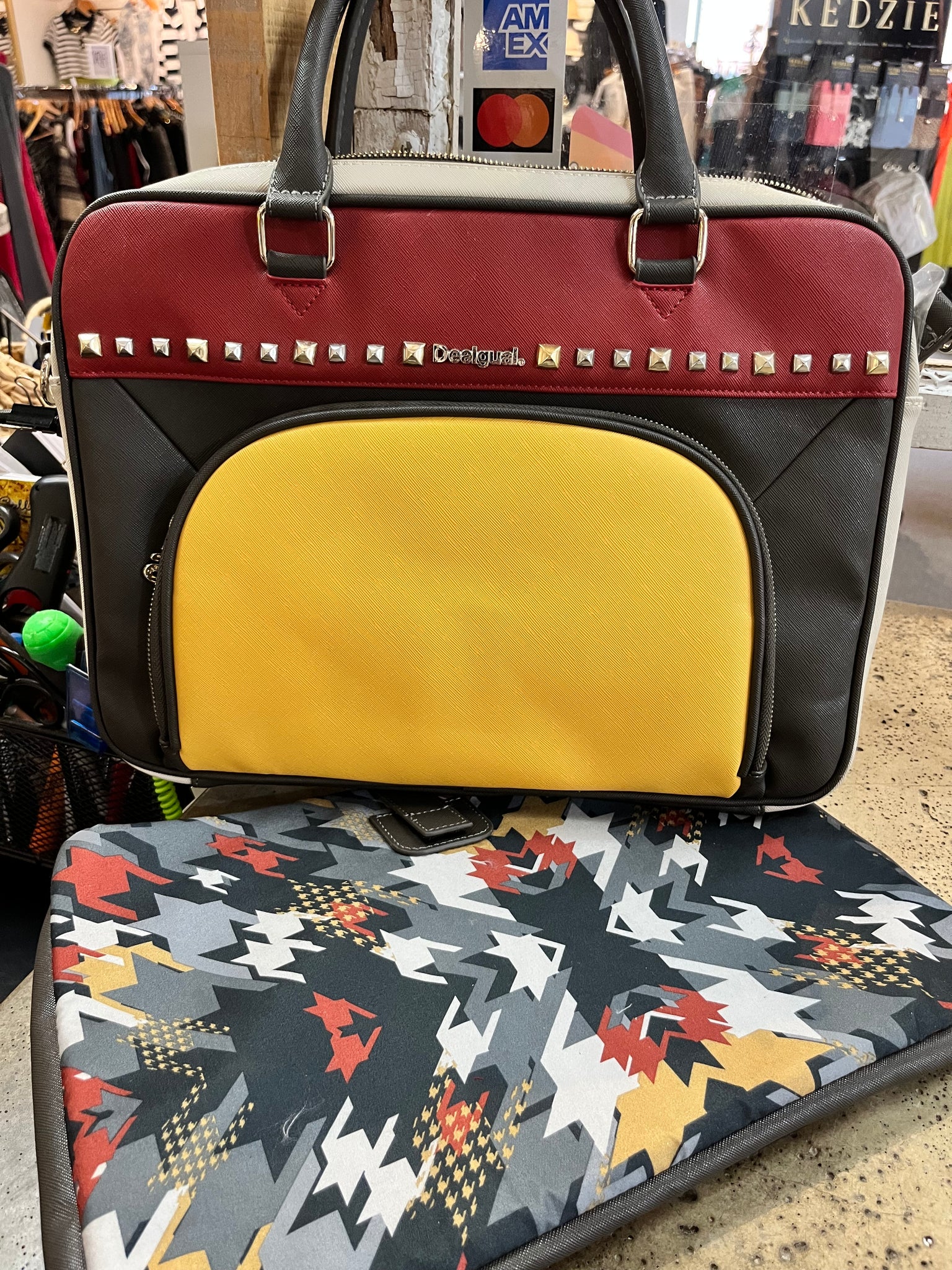 This vibrant Desigual computer case from Spain brings playful color-blocking and edgy studs to your everyday tech gear. Brand new with an extra strap still sealed in plastic, it features a handy front zipper pocket perfect for pens, cards, and small essentials. Plus, an extra padded sleeve keeps your computer safe and snug wherever you go. Stylish, functional, and ready to turn heads!  Measures 16" x 12" x 2" thick.