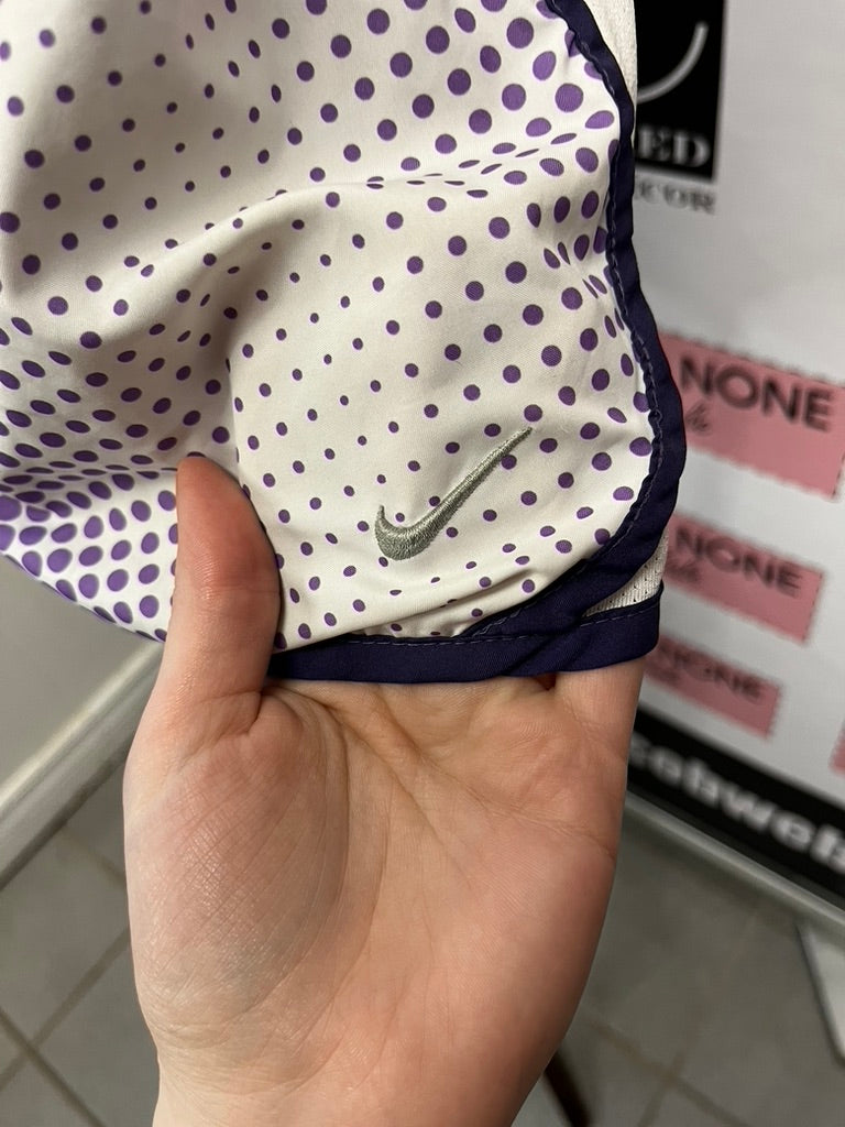 Run and play in style with these Nike Dri-Fit Shorts! Designed with white fabric and playful purple polka dots, these activewear shorts are perfect for any workout. The stretchy material provides comfort and flexibility while the dri-fit technology keeps you cool and dry. By Nike, these sports shorts are a must-have for any fitness enthusiast.