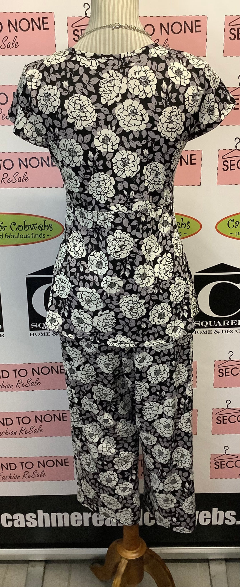 Step into playful comfort with this brand new Laura Ashley 2-piece set. Featuring a black lace-trimmed top with short sleeves and stretchy capri-length pants, both adorned in a charming black and lavender floral print with delicate foliage. Made from super soft fabric with an elastic waistband, this set is perfect for lounging in style while embracing effortless elegance.