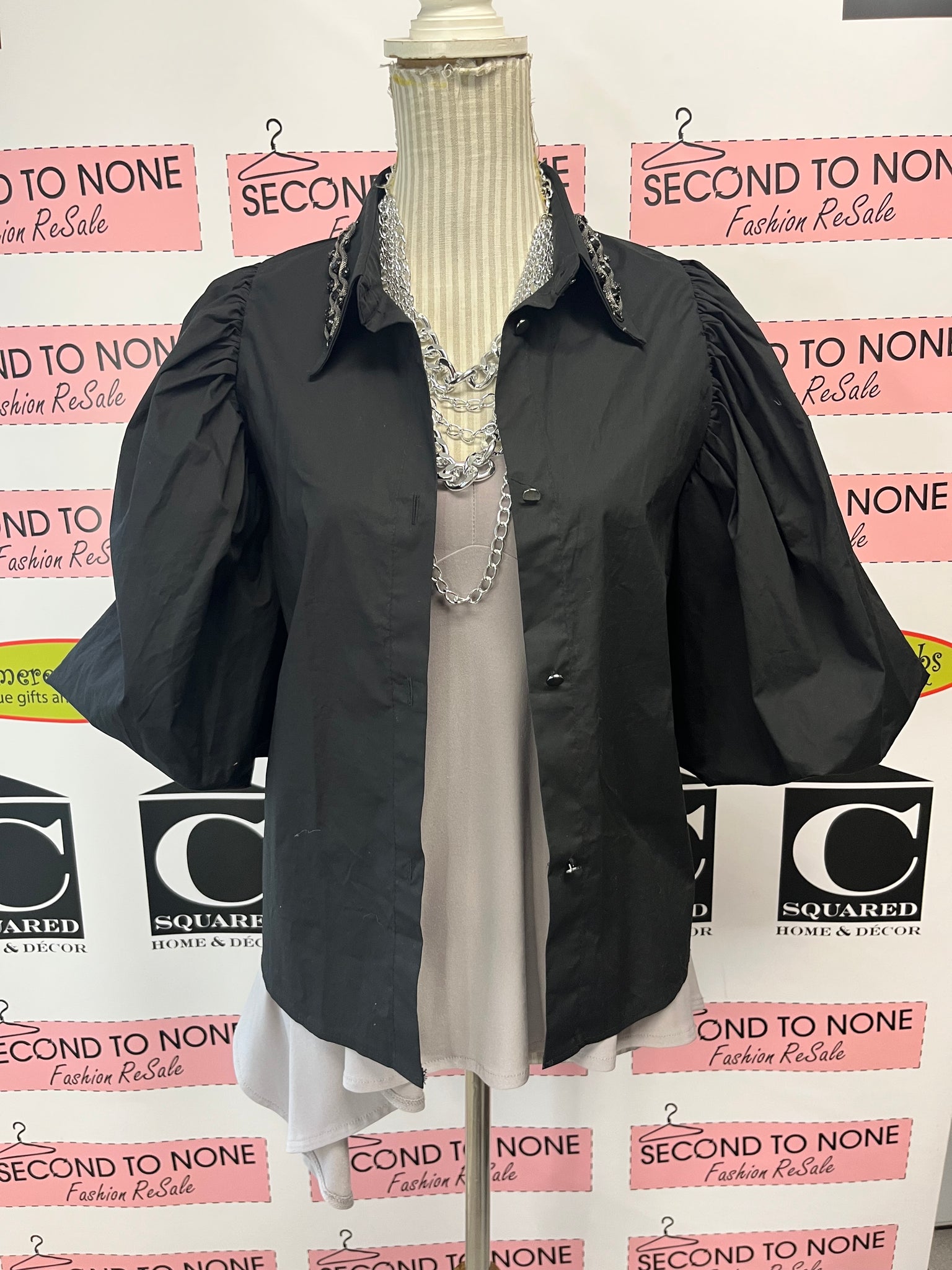 Add a touch of fun to your look with this crisp black cotton blend top. Featuring a button front and short extra-puffy sleeves, it effortlessly balances casual and chic. The neckline's chain and shiny black beads add a bit of sparkle, making it perfect for evenings out or dressing up your favorite jeans.  Elissia Europe brand.  79% cotton/18% polyamide/3% elastane,