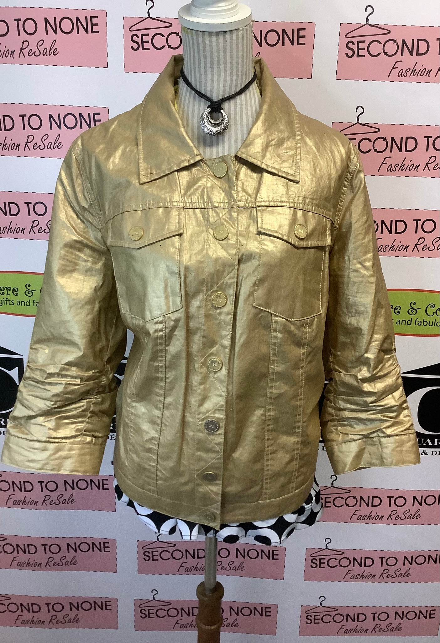 Step into the spotlight with this eye-catching Nygard Golden Metallic Jacket. Designed for petite frames (S/M), this 80s-inspired statement piece features long sleeves, a stylish collar, and convenient snap buttons. The luxurious cheetah lining adds an unexpected twist, while two front chest pockets offer functionality. Golden buttons and star accents create a funky, shimmering effect that demands attention. Pair with your favorite top for an unforgettable retro look that turns heads everywhere you go.