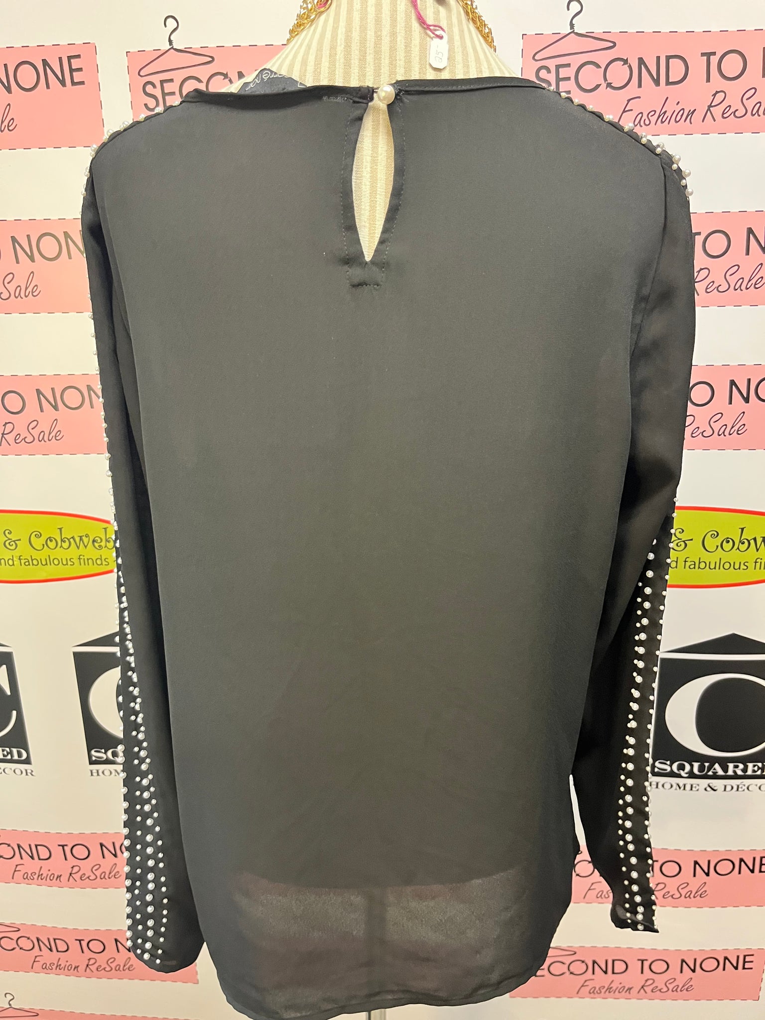 Elevate your style with this Pearl Sleeve Blouse, where classic meets unexpected charm. The standout feature? Sleeves lined with seven rows of delicate pearls, adding a playful twist to your everyday black blouse. Whether you’re aiming for edgy or sophisticated, this blouse effortlessly adapts to your mood and occasion. Perfect for turning heads with a subtle sparkle!  Carre Noir brand. 100% polyester