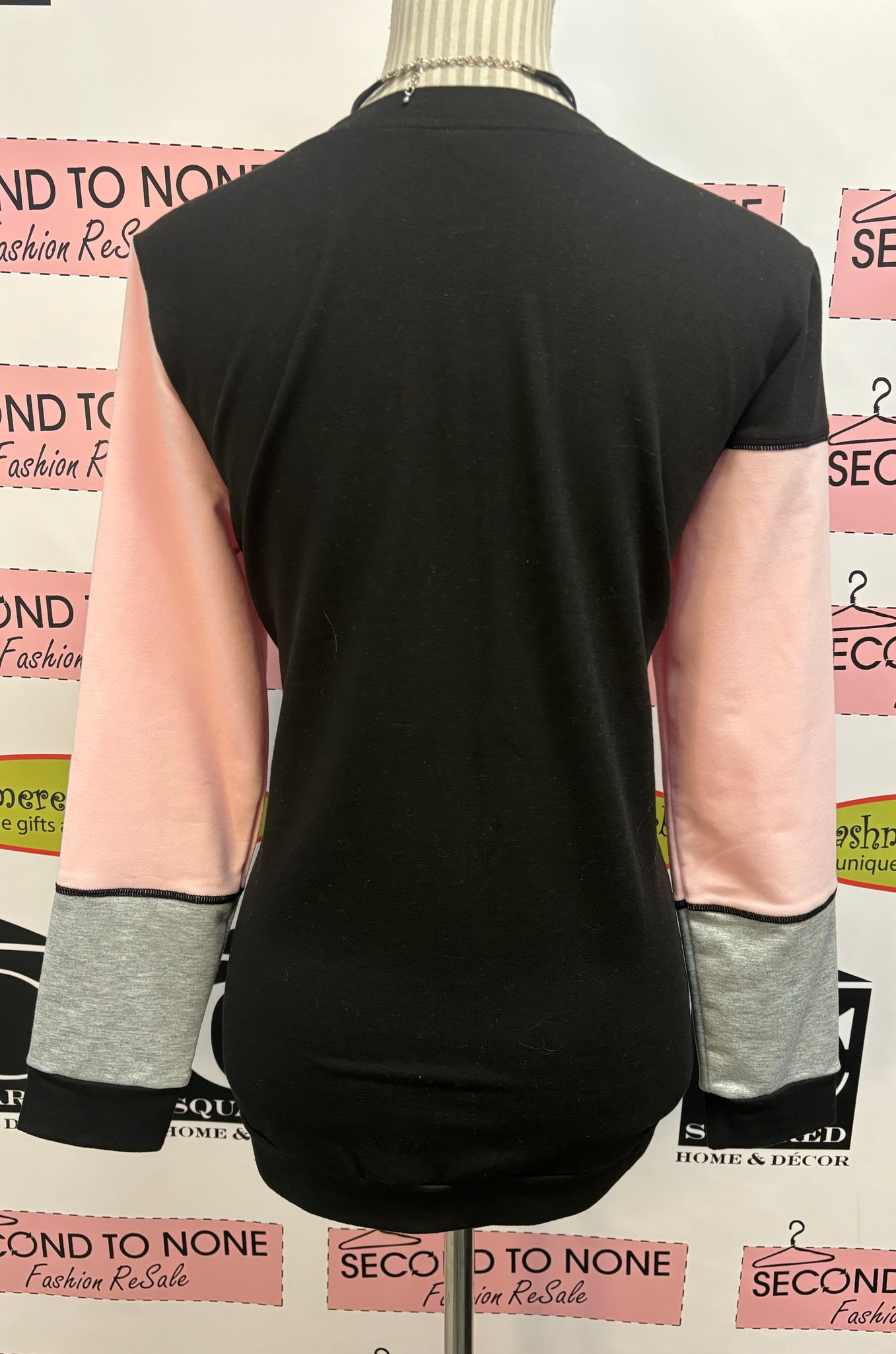 This playful long sleeve features a trendy pink, grey, and black colorblock design that’s both artsy and unique. With its flattering scoop neck and elevated style, it’s perfect to wear solo or layered under a chic vest or jacket. Super cute and effortlessly cool, this top lets you accessorize your way and truly speaks for itself. A must-have for adding a fun pop to your wardrobe!