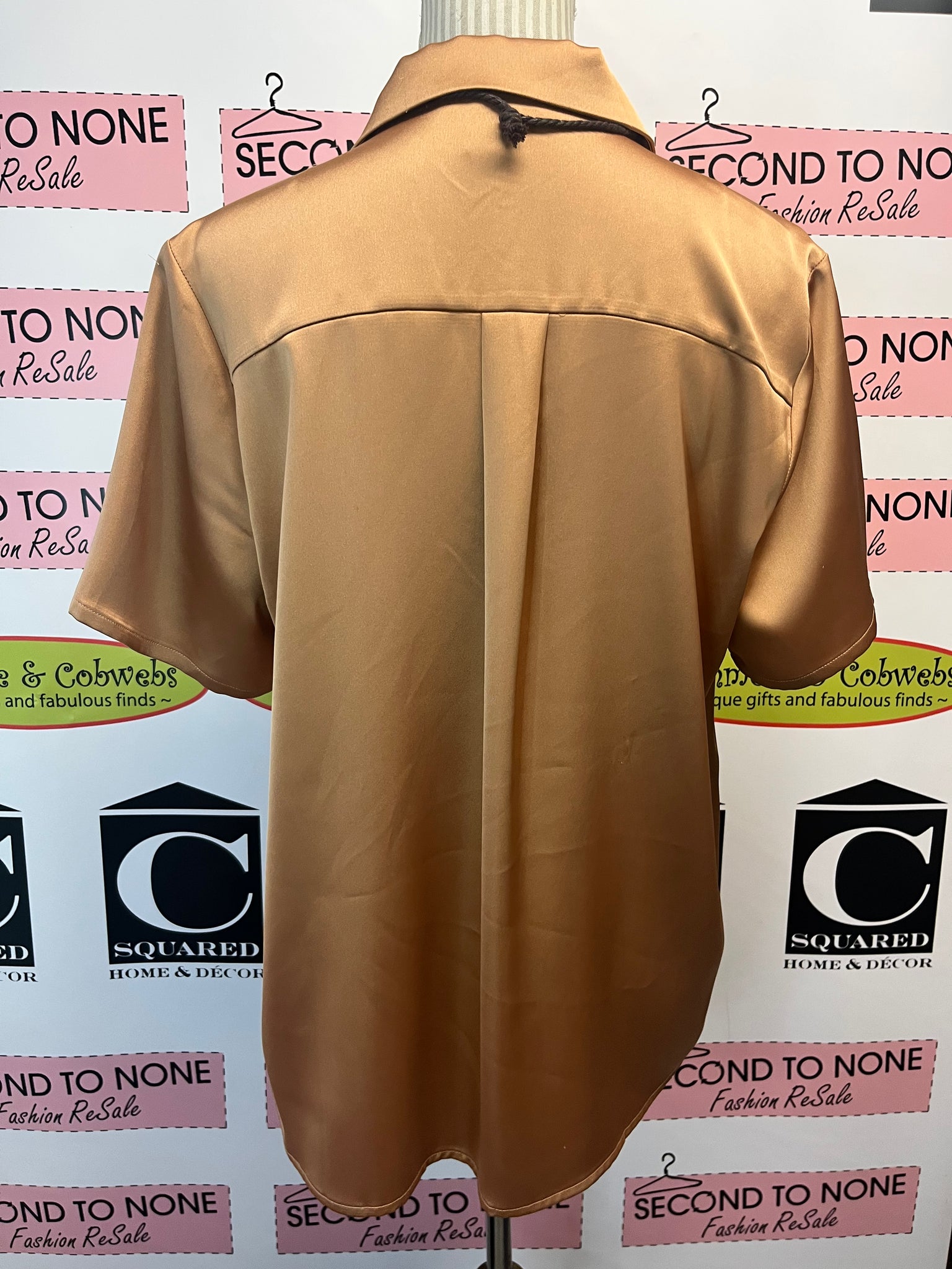 Step into chic elegance with this Rachel Zoe satin top in a warm bronze hue. Featuring a classic collar and playful short sleeves, its button-up front adds a flirty touch while the silky satin-like fabric keeps you feeling smooth and stylish all day. Perfect for dressing up or down, this top brings a subtle shimmer to your wardrobe with effortless charm.