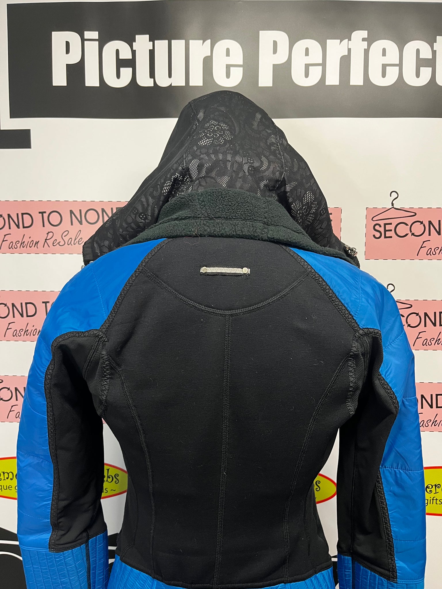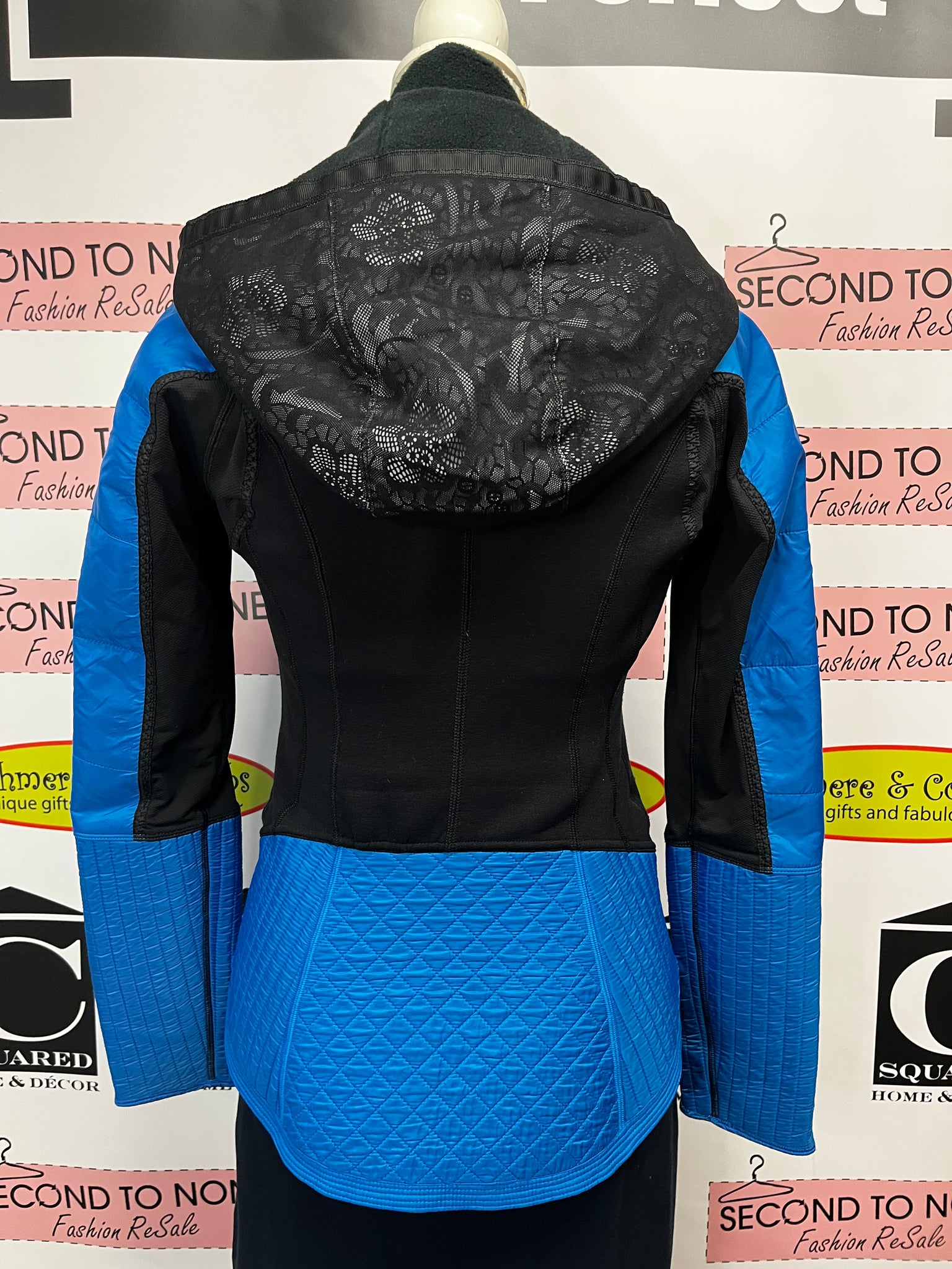 Stay cozy and cute with this Rare Lululemon Bundle Up Jacket! The beaming blue color will brighten up your workout, while the soft fleece and water resistant material keep you warm and dry. Perfect for running with its zip up front, reflective details and removable lace designed hood. A rare find from Lululemon! Size not indicated but fits like a XS/S.