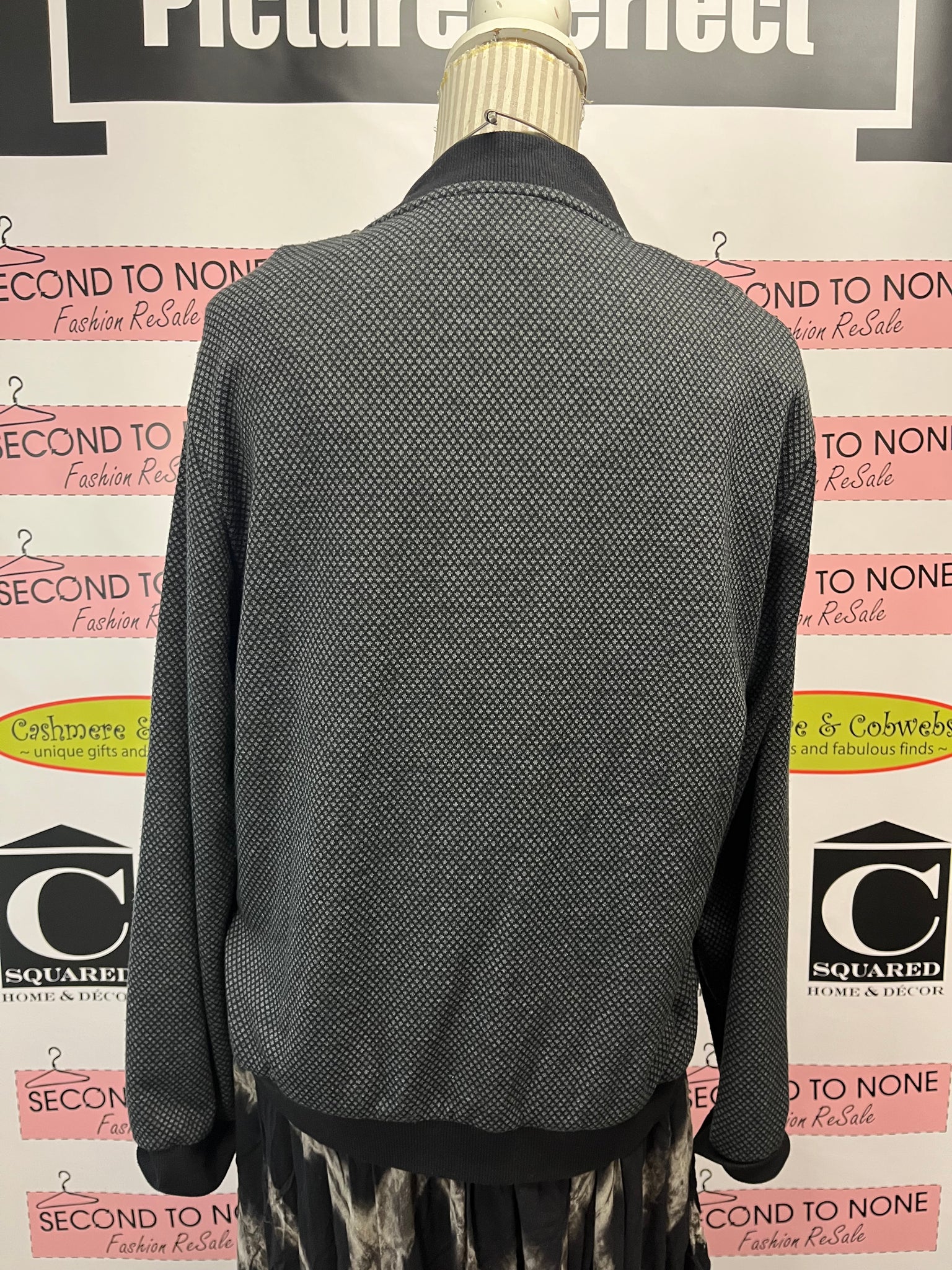 This Red Coral sweater combines bold black and grey square prints with a bomber silhouette for a modern look. Featuring a zippered front and edgy faux leather and lace accents along the shoulders, it adds a stylish twist to your wardrobe. Available in size XXL, it offers both comfort and standout design for confident everyday wear.
