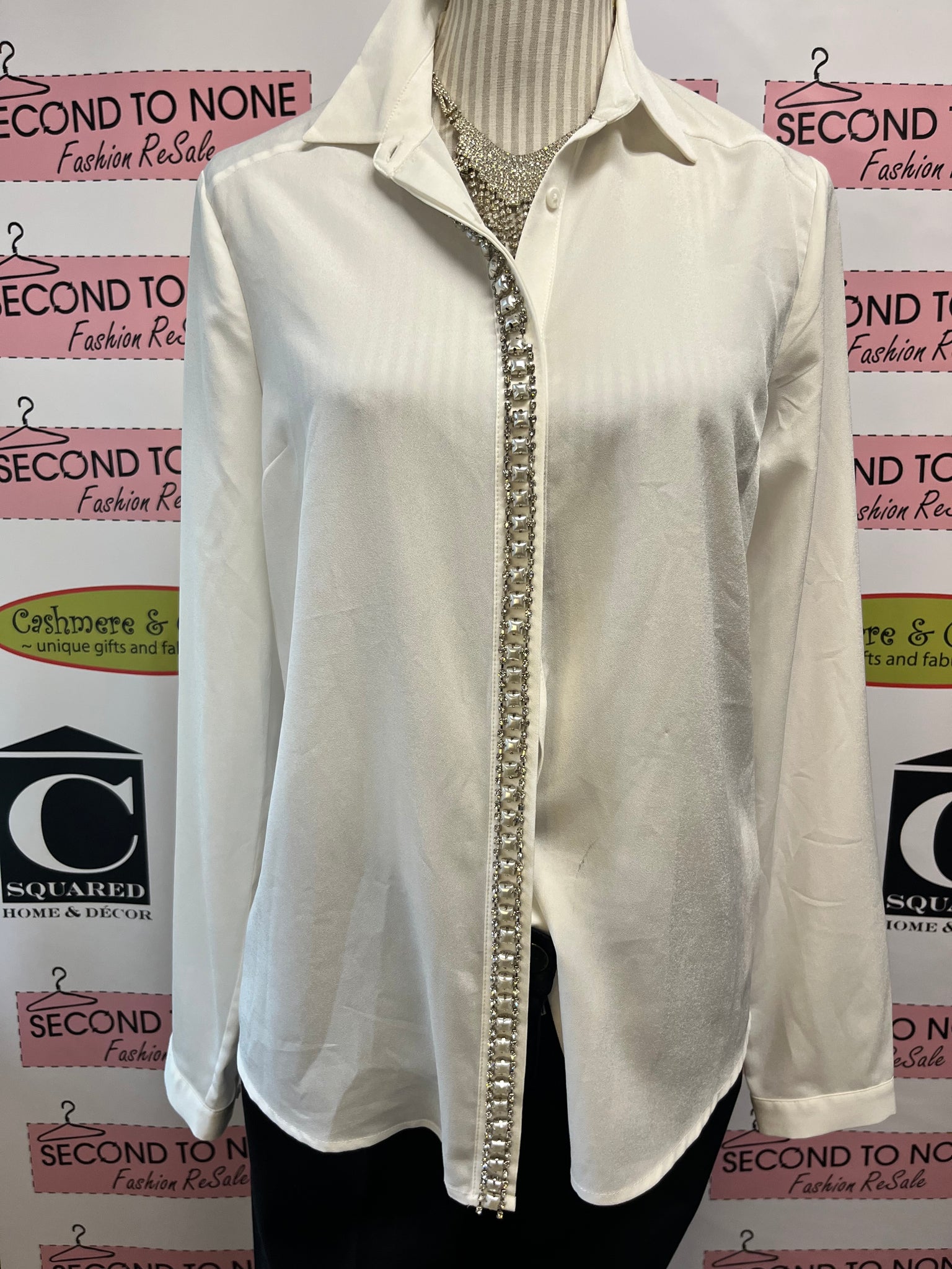 Add a touch of sparkle to your wardrobe with this playful white blouse from RW&Co. Crafted from a slightly sheer fabric, it offers a light and airy feel perfect for layering or wearing on its own. The button-front design is accented with a shimmering rhinestone trim, adding just the right amount of glitz to brighten any outfit. Ideal for dressing up or down, this blouse brings effortless chic and a hint of fun to your everyday style.
