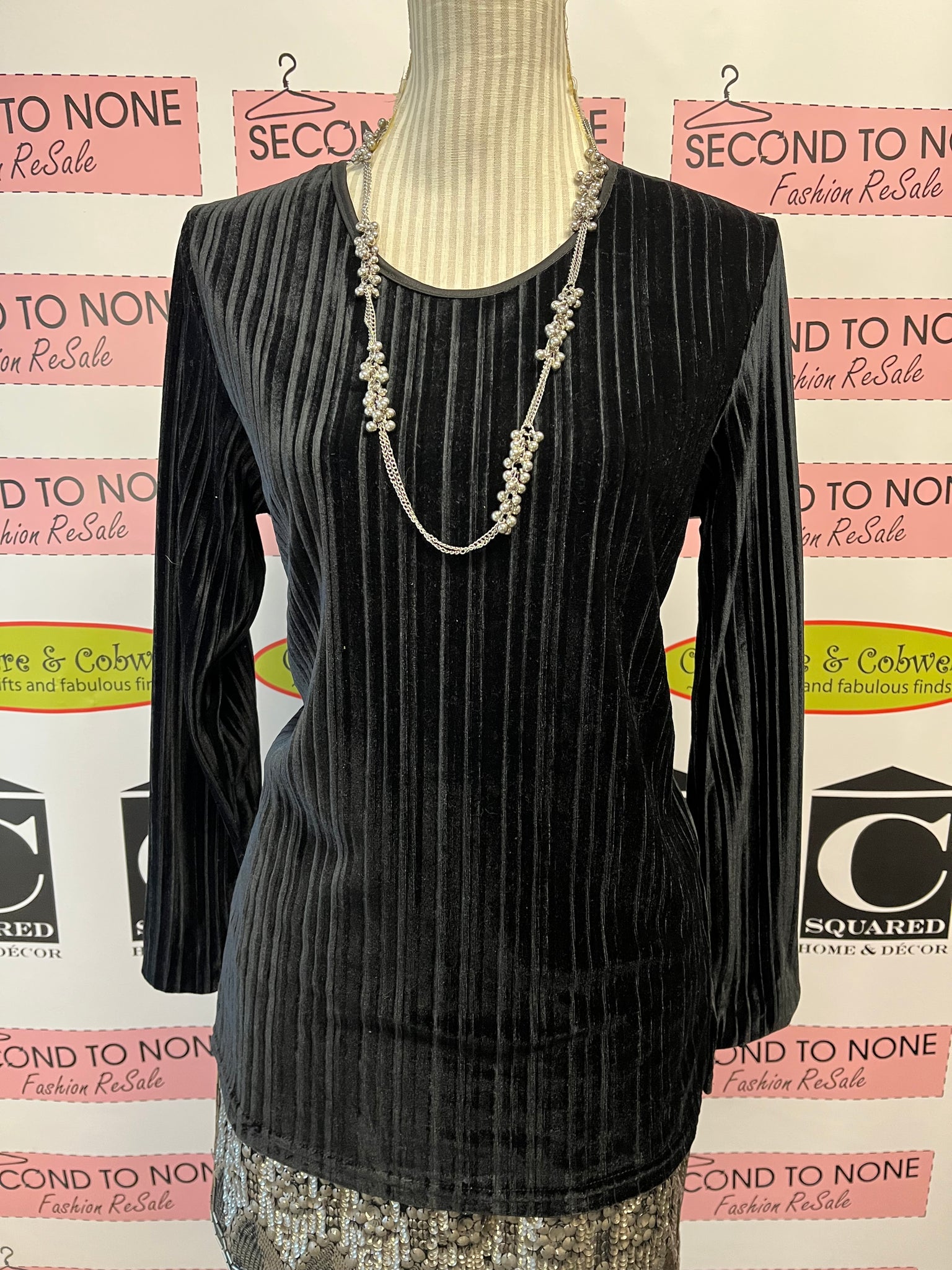 Embrace cozy elegance with this dark, shiny black ribbed velvet top. Its long sleeves and rounded neckline create a flattering, comfortable fit perfect for day-to-night wear. The plush velvet texture adds a touch of playful glamour while keeping you warm and stylish all season long.