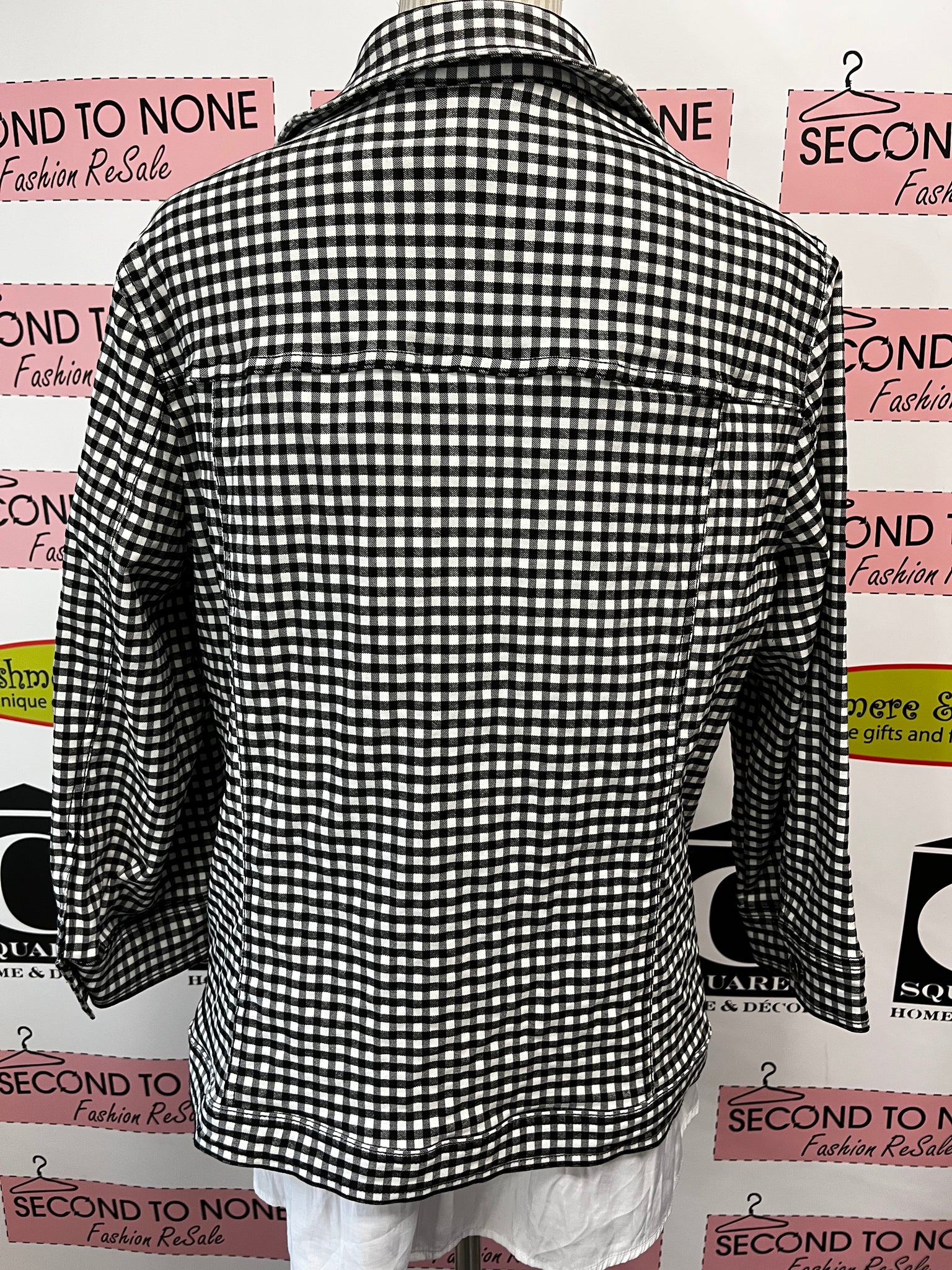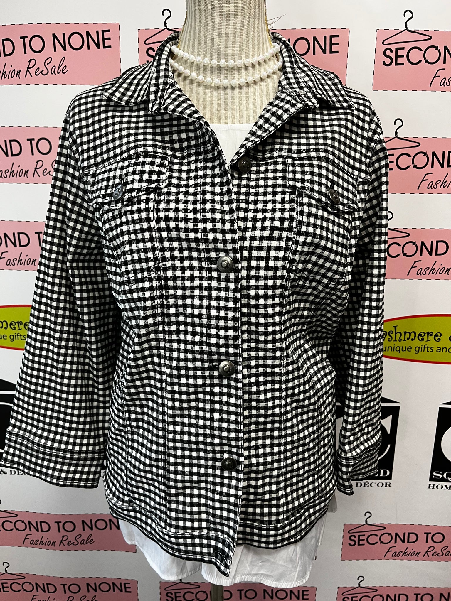 Step into effortless style with the Ruby Rd. Gingham Jacket in size 18W. This stretch jacket, adorned with a lively black and white gingham pattern, snaps up with easy button closures for a look that’s both comfy and cute. Made in Guatemala, it’s your new go-to for mixing classic vibes with playful flair!
