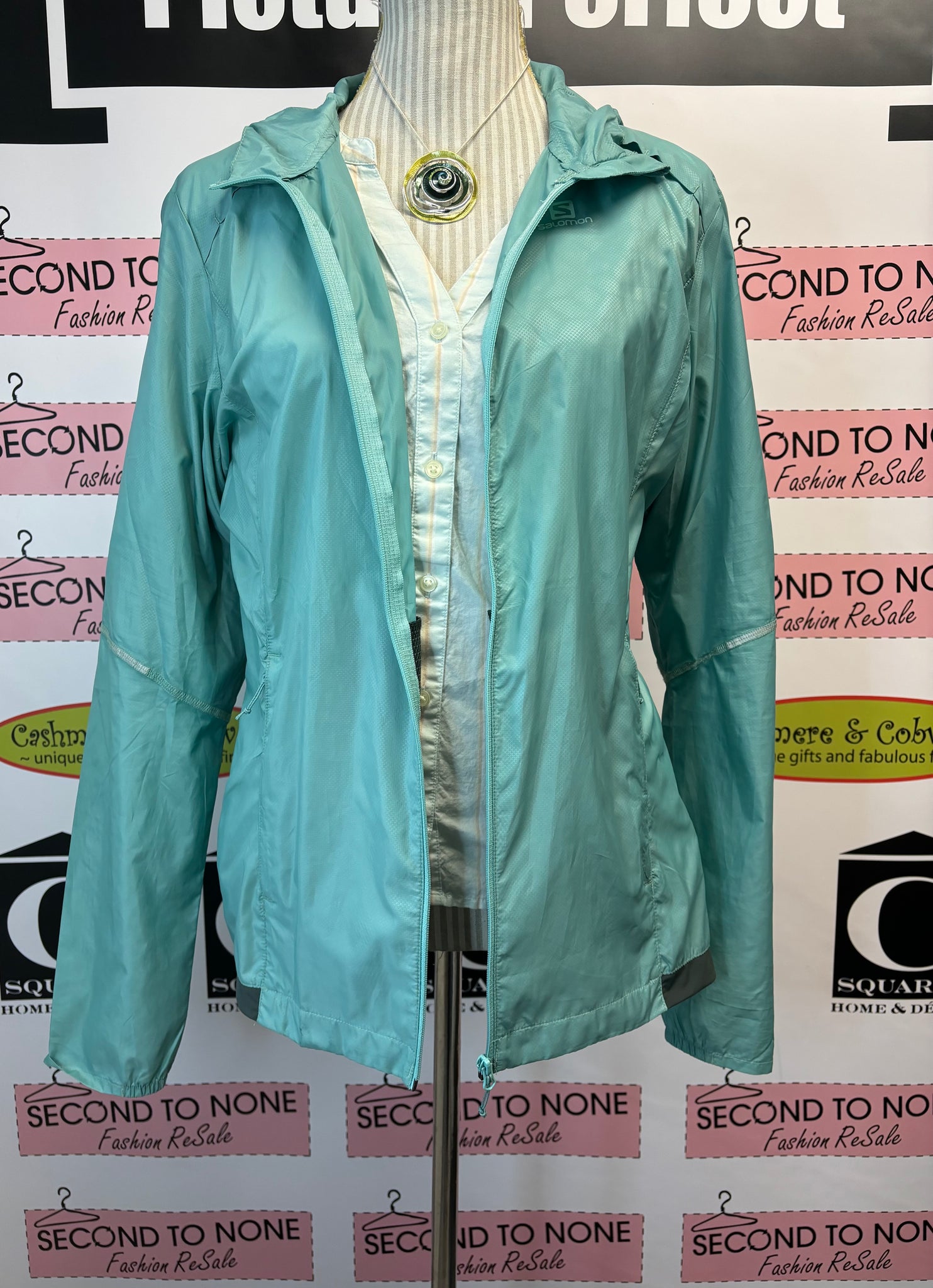 The Salomon Wind Breaker (Size XL) is the perfect choice for outdoor activities. Its teal colour and hooded design offer both style and functionality. Made with lightweight material, it provides rain protection while remaining breathable. With zippered and mesh insert pockets, it's ideal for golfing or jogging. Layer a sweater underneath for extra warmth. Stay on trend this spring with this cute and brightly coloured wind breaker from a great brand.