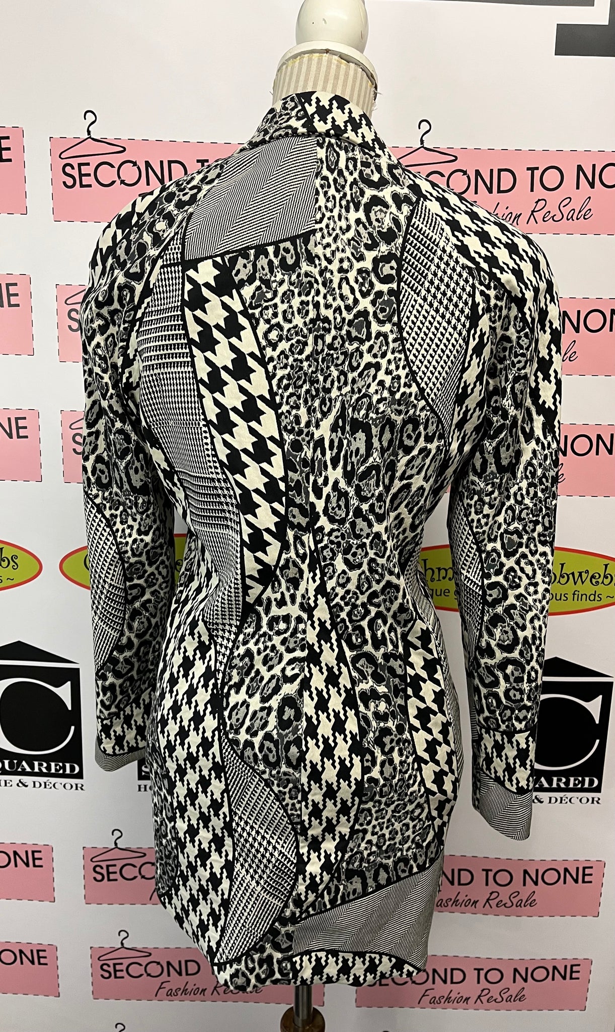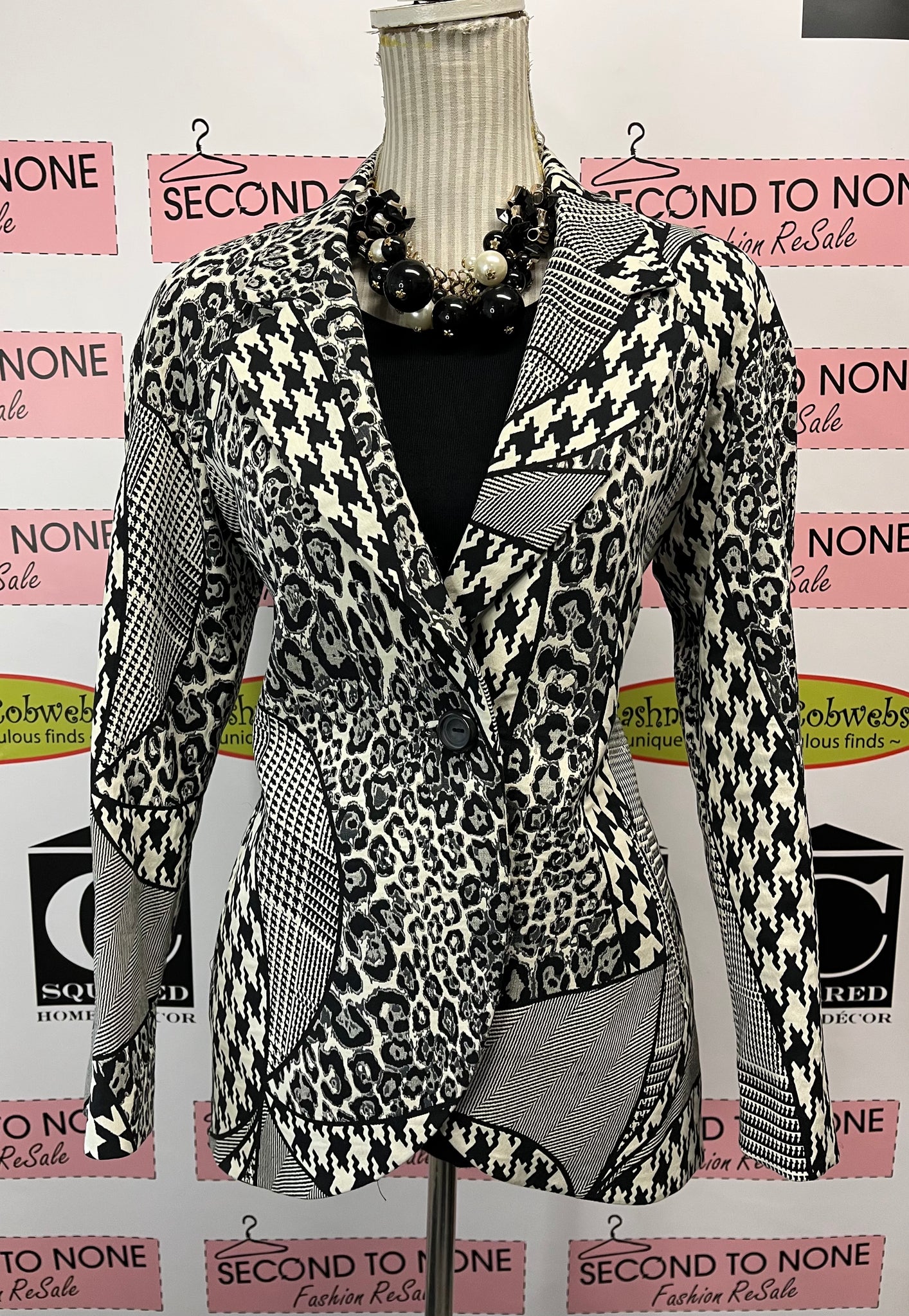 This Simon Chang jacket is a print lover's dream! Featuring a bold mix of black and white houndstooth, stripes, and animal prints, it's the kind of statement piece that makes getting dressed fun. The single button closure keeps things sleek and sophisticated, while the full lining ensures comfort all day long. Practical pockets add everyday functionality to this eye-catching design. Perfect for anyone who loves to mix patterns with confidence.