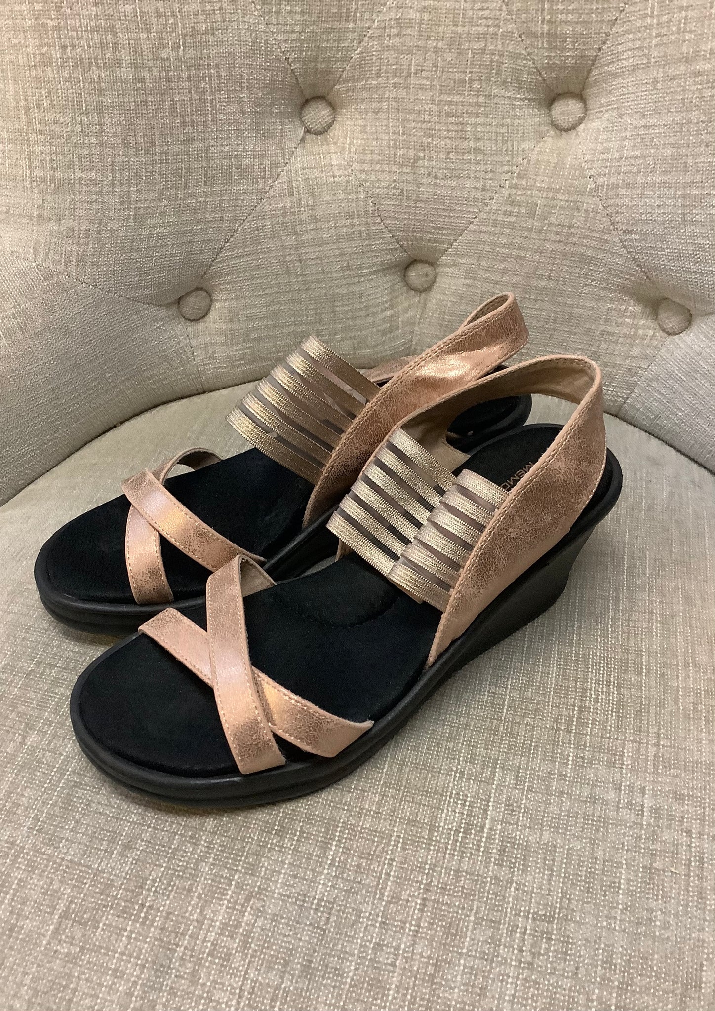 Step into summer with these playful Skechers Memory Foam Sandals in size 8! Featuring a chic rose gold strappy elastic bandage and a bold black chunky sole, the 2.5-inch wedge boosts your height while keeping you comfy. Perfect for beach days, weddings, or vacation strolls, these sandals provide excellent foot support with soft memory foam cushioning—where style meets all-day comfort for your sunny adventures.
