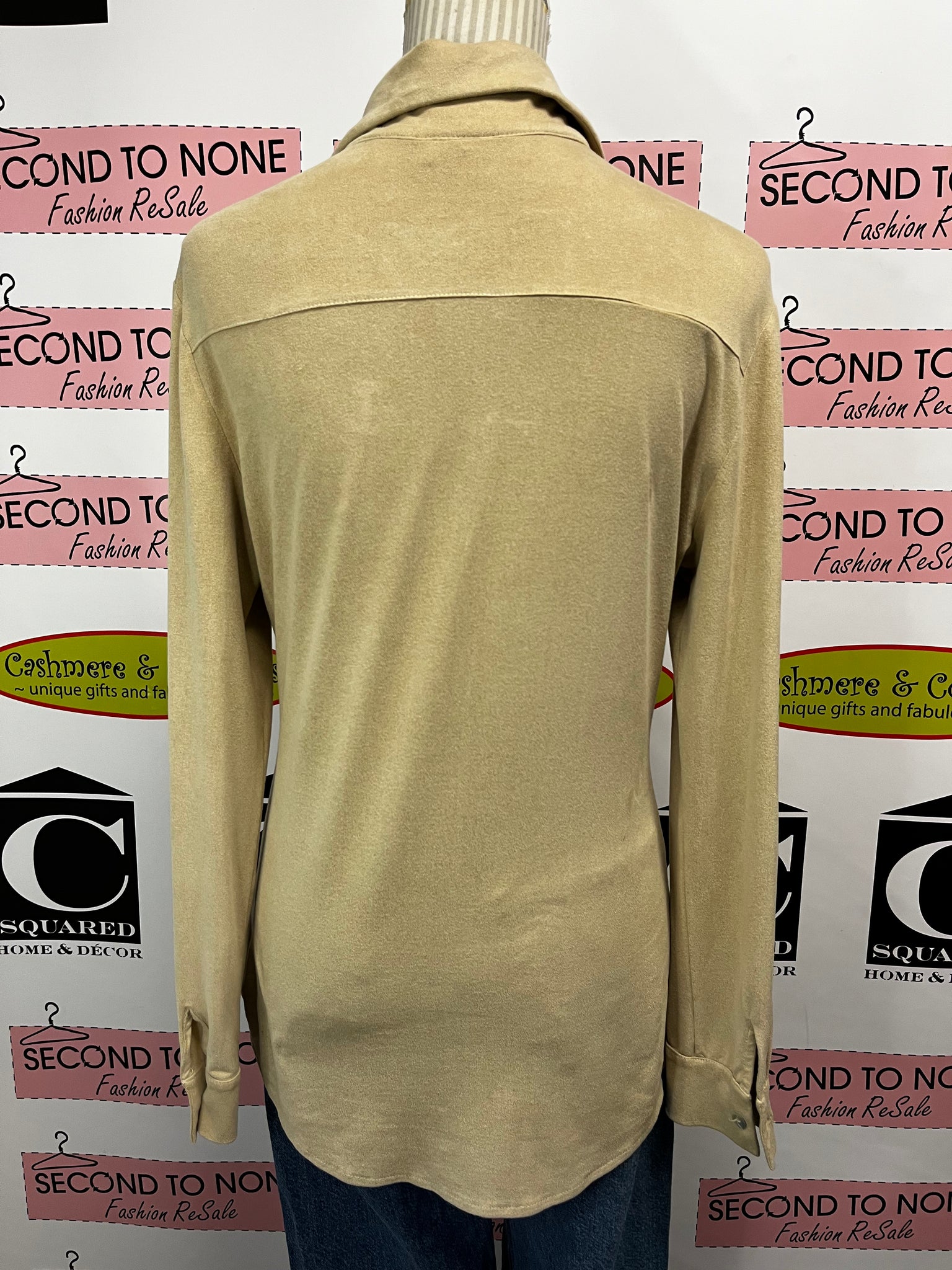 Upgrade your wardrobe with our Stretchy Beige Button Down Shirt that is made in Canada. The super soft and stretchy fabric in a camel beige color will make you feel luxurious and comfortable. The unique button detail, with spaces between every other shimmery pearl coloured button, adds a touch of sophistication. Plus, the sleeves can be pinned up for versatile styling options. Dress it up or down for any occasion. Brand: Brenda Beddome. Size 6.