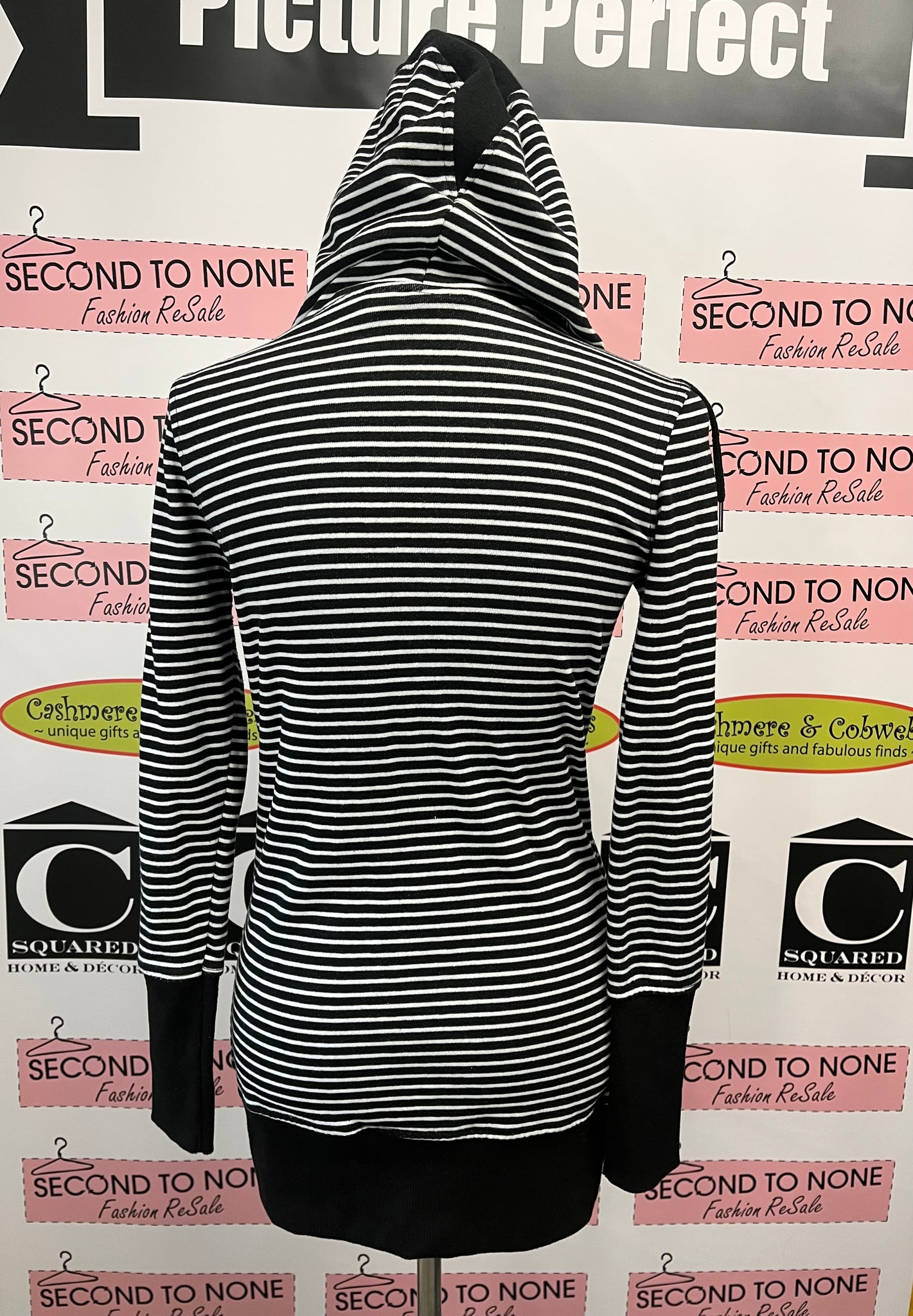 Stay cozy and stylish with our Striped Hooded Tunic from Jo&Co Jeans. This black and white sweater features a zippered henley neckline and kangaroo front pocket for convenience. The wide ribbed cuffs and hemline provide ultimate comfort. Perfect for any casual occasion, add this tunic to your wardrobe for an effortlessly chic look!