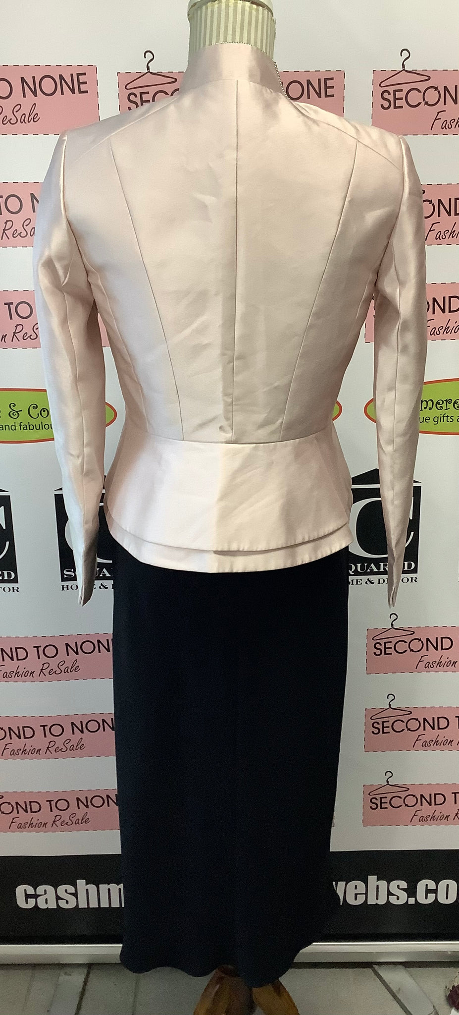 This luxe Tahari blazer in blush pink combines a silk-like sheen with playful sophistication. Featuring long sleeves, padded shoulders, and a crisp collar, it’s designed to be a standout fashionista statement piece. The pleated backing adds a chic twist, and sparkling gemstone buttons let you wear it open or closed. Pair it with a flowing maxi dress to effortlessly elevate your style with a touch of glamour and fun.