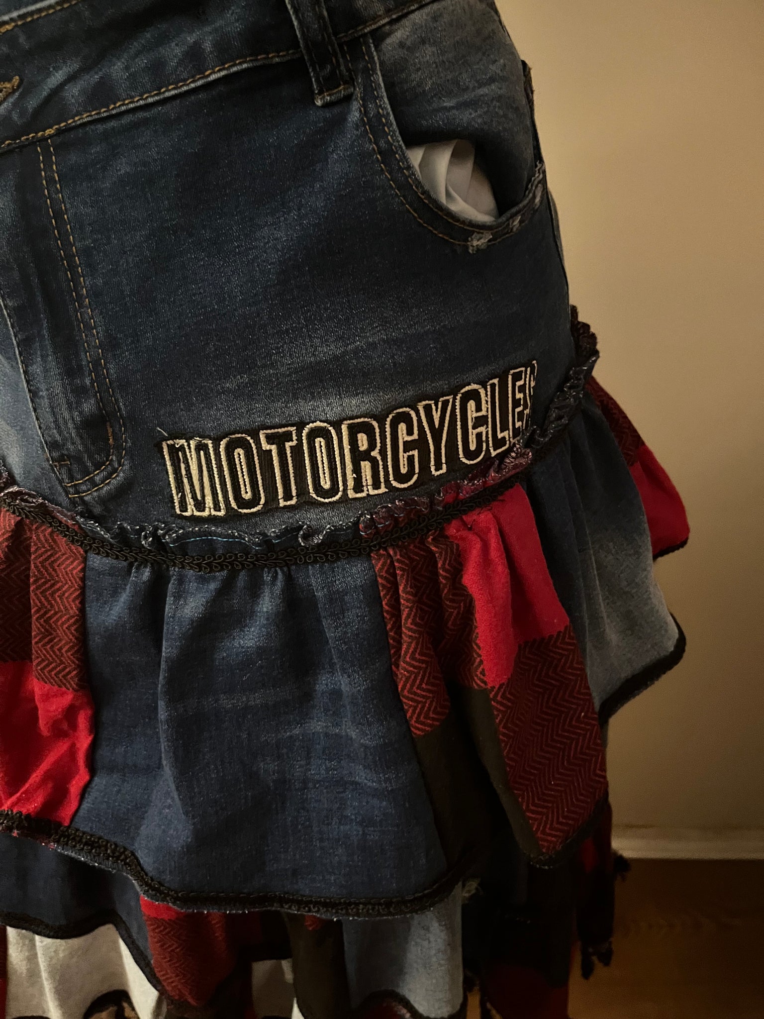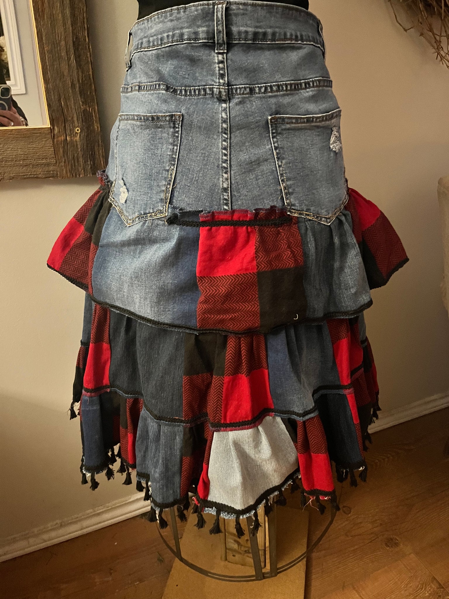 This upcycled denim skirt is a fashion rebel's dream! The cute denim upper features an edgy angled fly fastener, while a cool motorcycle patch adds that perfect touch of attitude. Playful plaid and denim ruffled layers cascade down to a sassy black fringe bottom. It's the perfect blend of punk and pretty for your one-of-a-kind wardrobe!