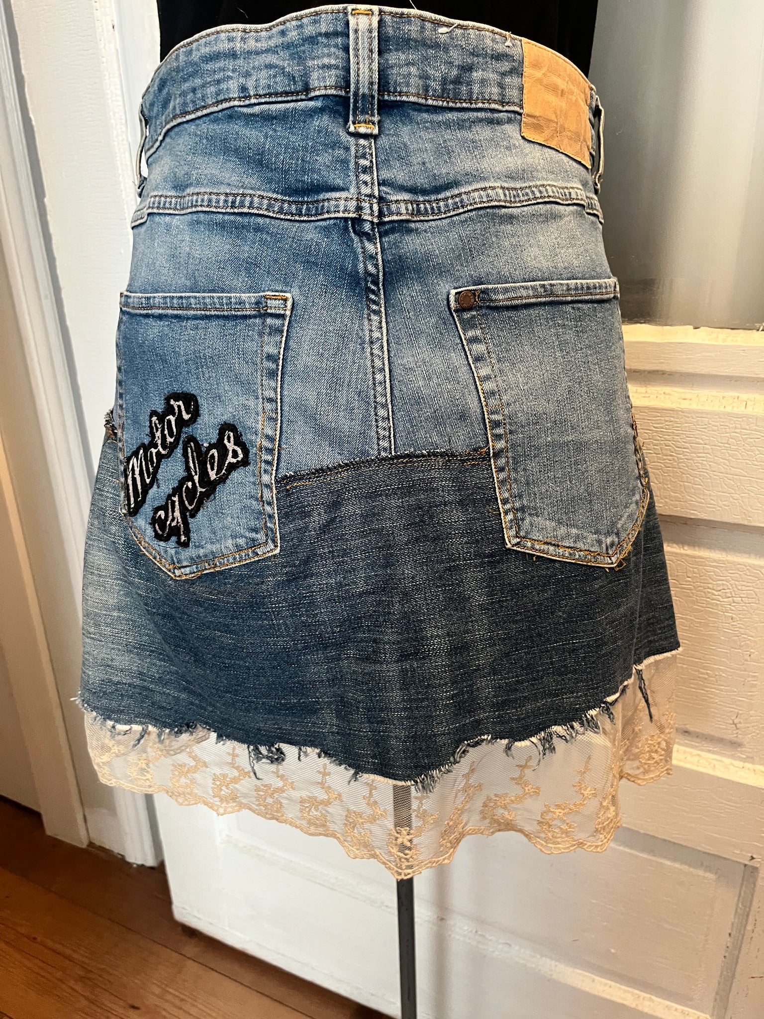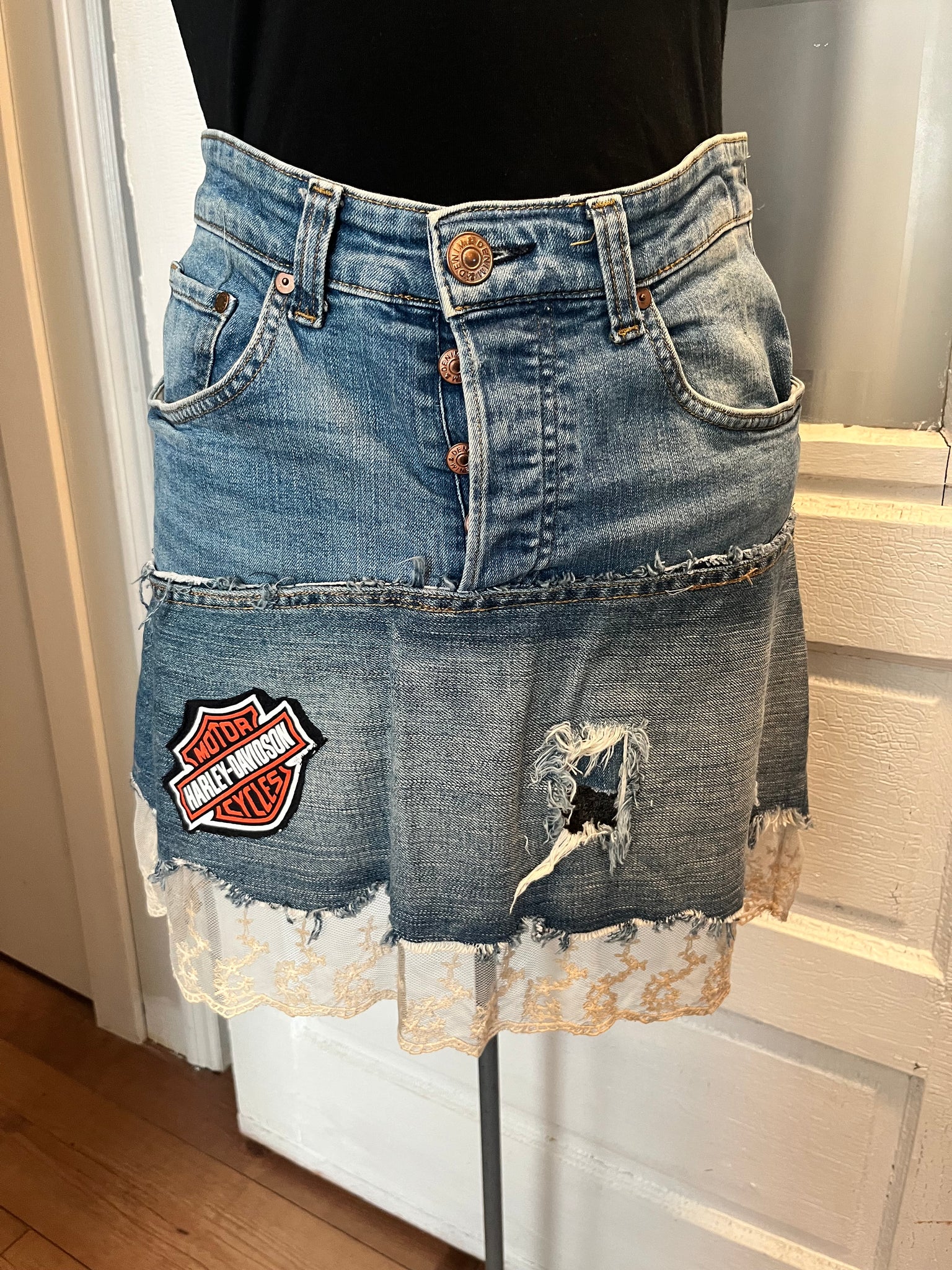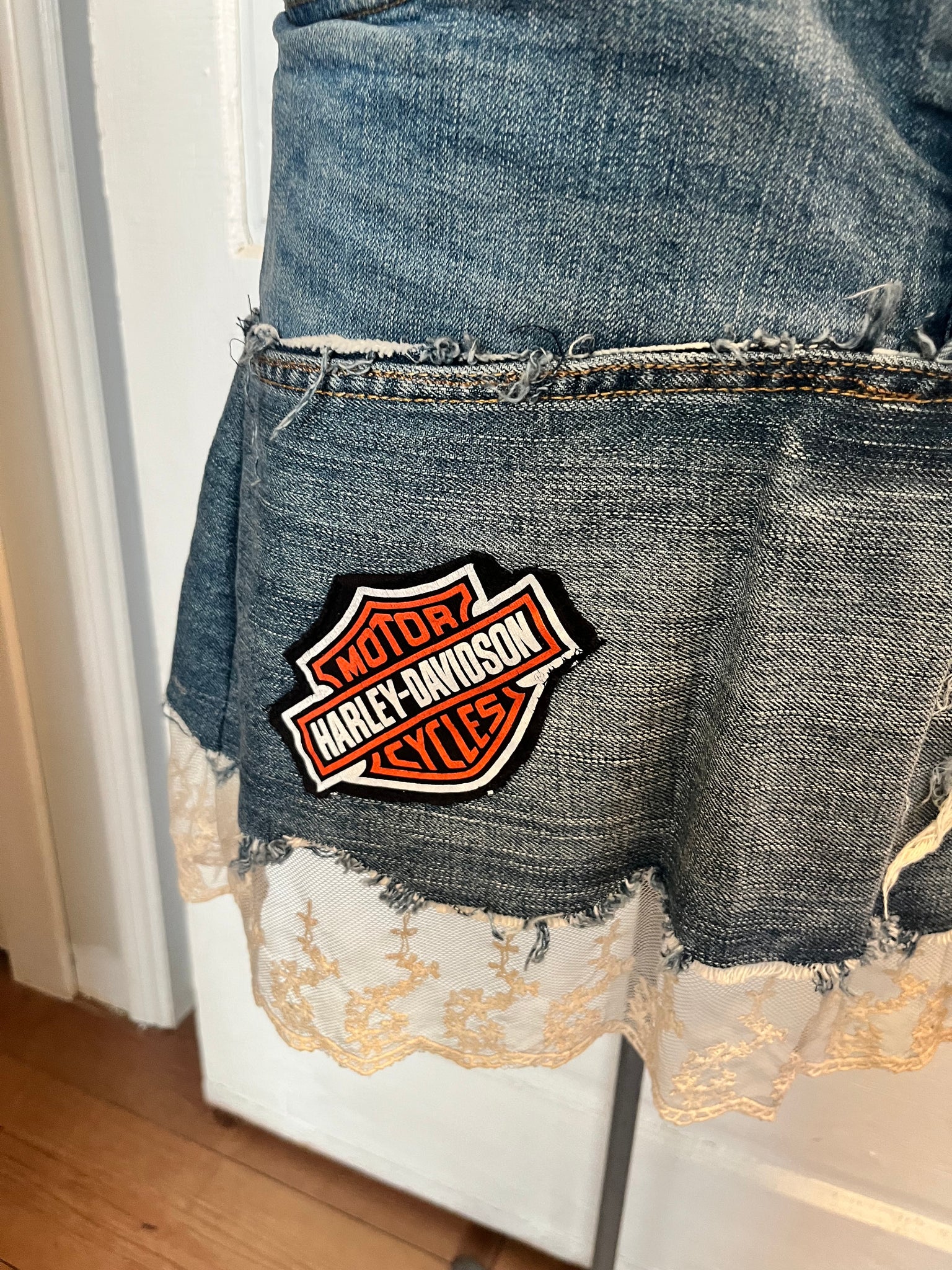 Unleash your inner rebel with this adorable mid-wash denim skirt! Featuring edgy ripped details and an authentic Harley Davidson patch on the front, this upcycled beauty strikes the perfect balance between tough and sweet. The button-front fly and "motorcycle" patch on the back pocket add genuine biker charm, while the delicate lace hem creates an unexpected feminine twist. Ride in style with this one-of-a-kind statement piece!