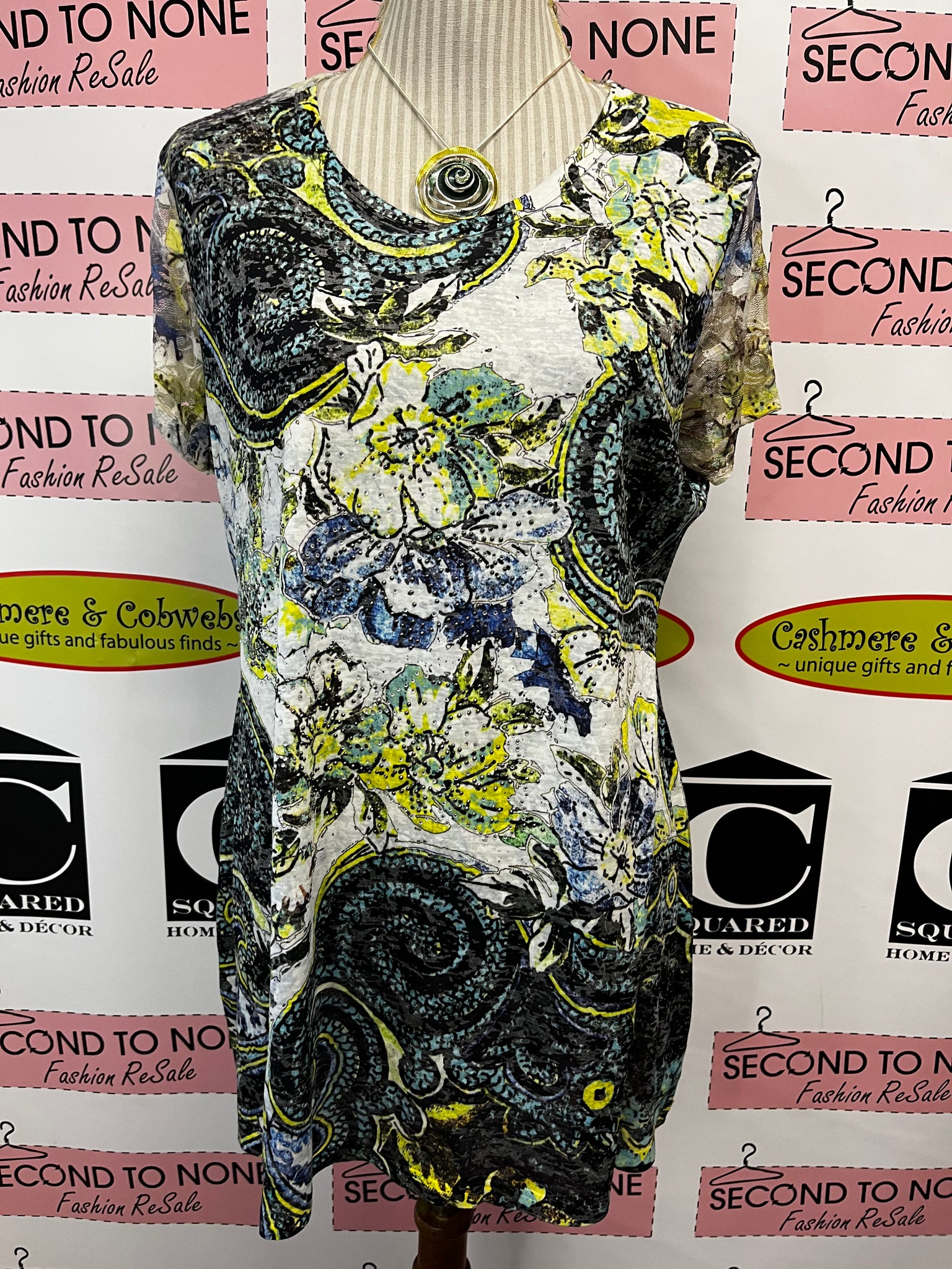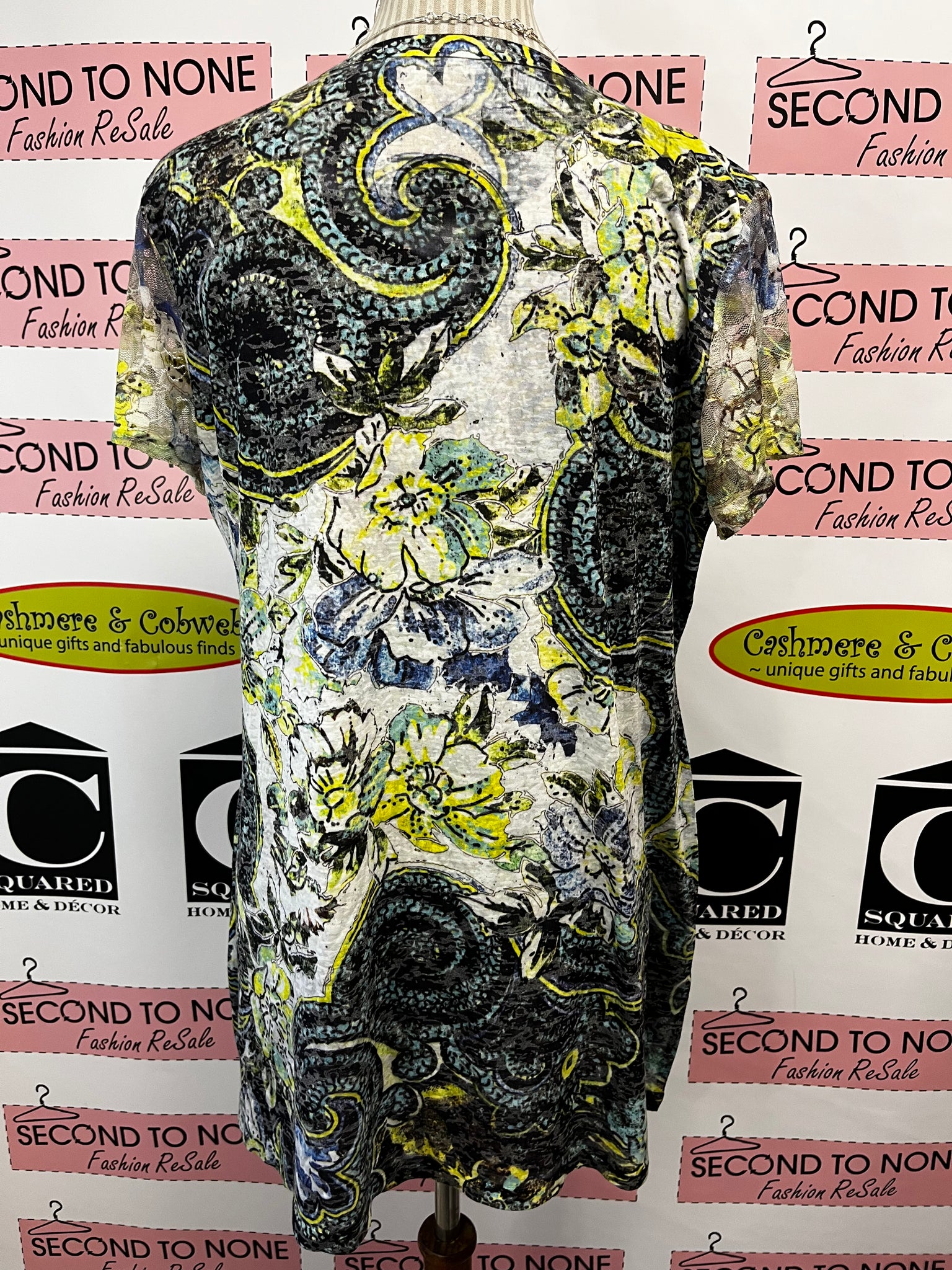 Add a splash of sparkle to your wardrobe with the Variations Bling Top. Featuring a subtle floral pattern in green, teal, black, and white, this lightweight top shines with bling details all over the front. Its longer length offers a flattering, effortlessly stylish look perfect for layering or wearing solo. Playfully chic and comfortable, it’s a vibrant choice for adding flair to any outfit.