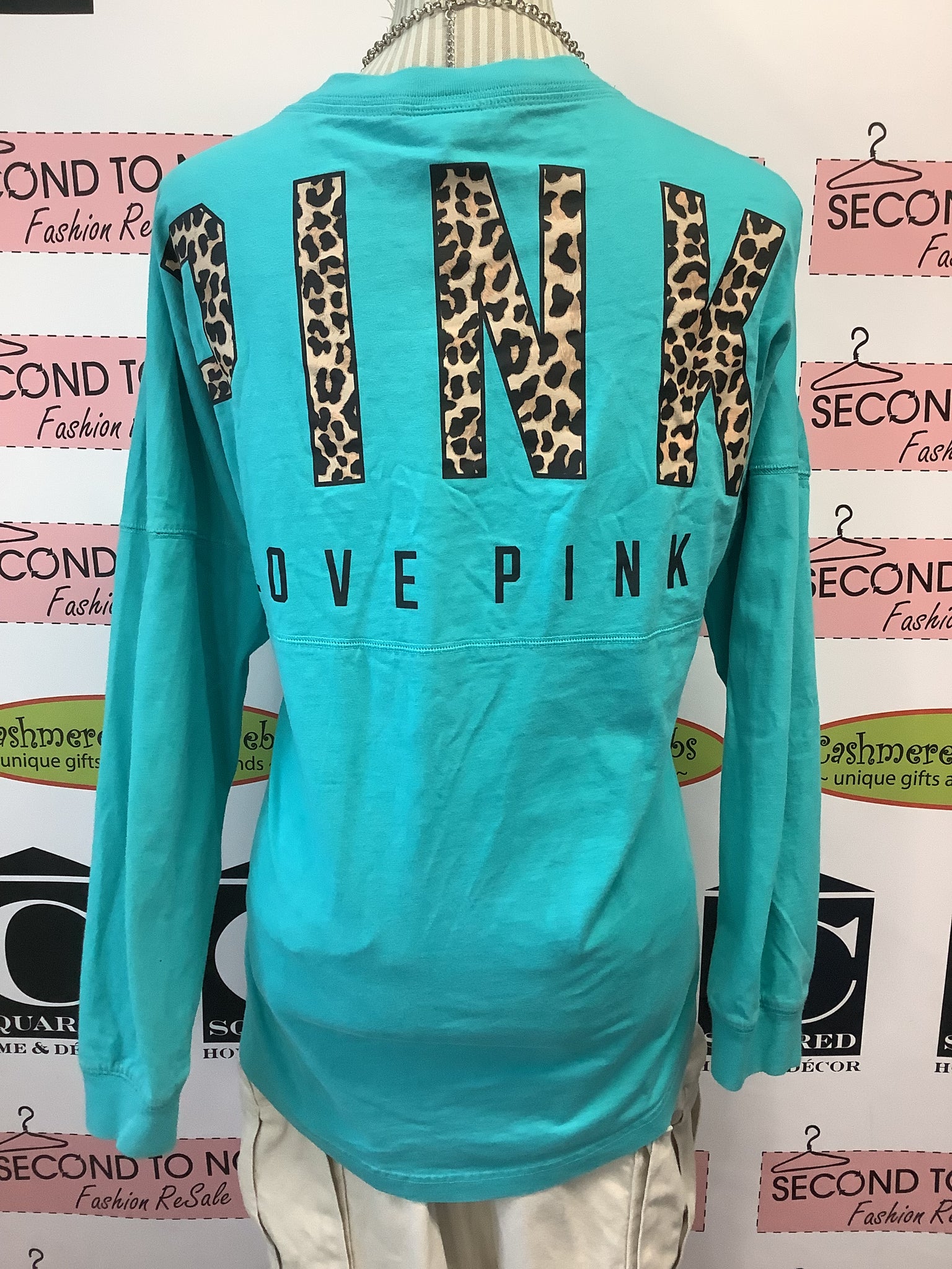 Elevate your style with our Victoria’s Secret Teal Crewneck. This sweatshirt features a classic scoop neck and long sleeves, adorned with our iconic dog logo on the front and a bold spread on the back. The teal color and cheetah print detailing add a trendy 2000s vibe to your wardrobe. Perfect for any fashionista, this comfortable sweatshirt can be paired with cute cargos for a bold and adventurous look!