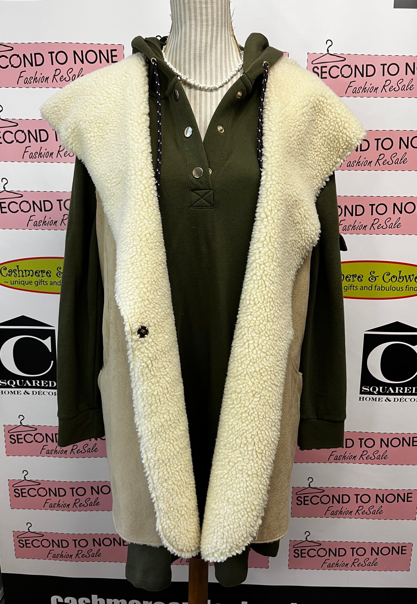 Snuggle up in style with the Zoria Faux Suede Vest. Featuring a cozy faux fur lining, this beige vest also boasts a fashionable criss cross front and easy snap button closure. Perfect for layering, this vest by Zoria is a must-have for any wardrobe.
