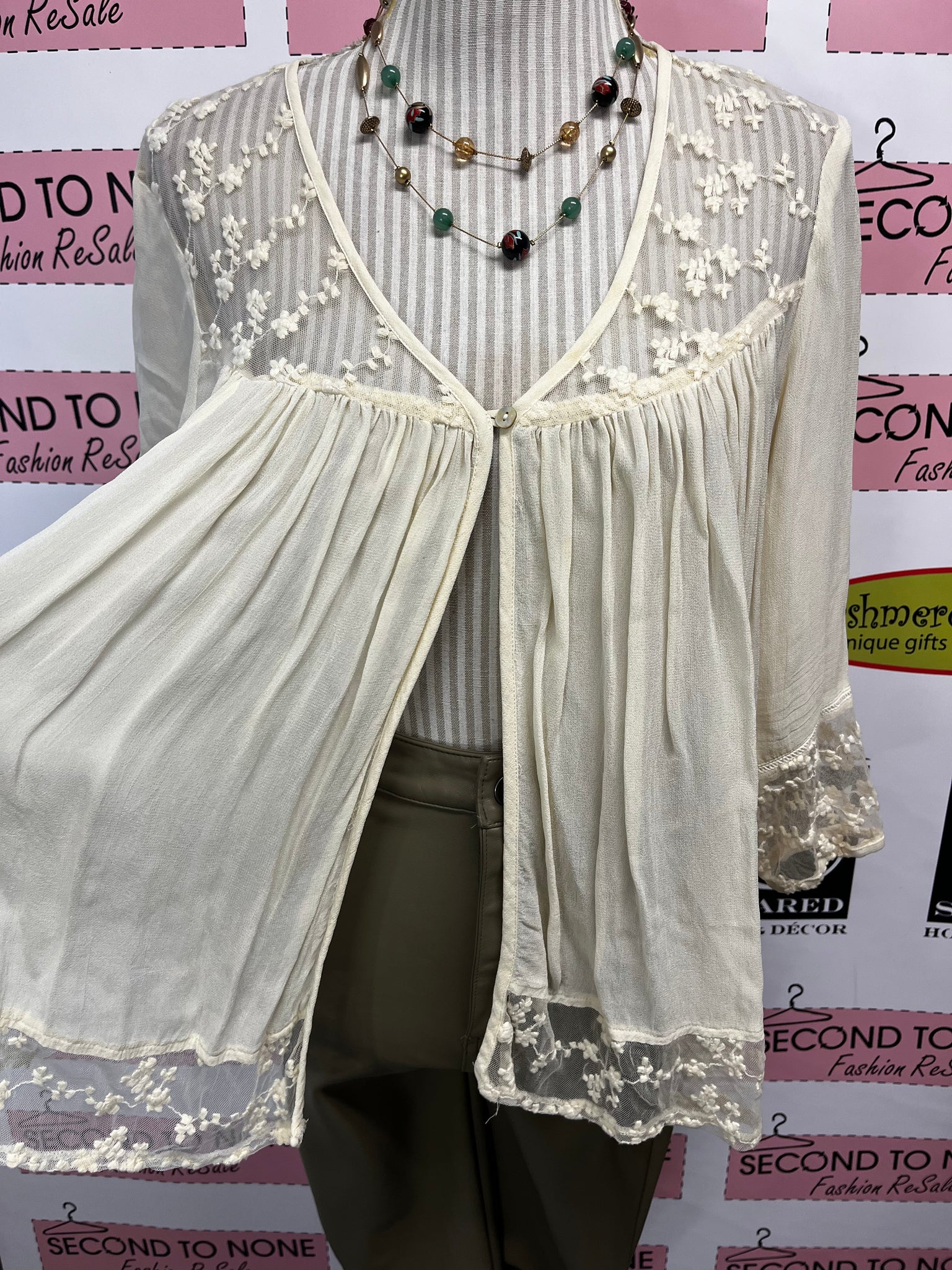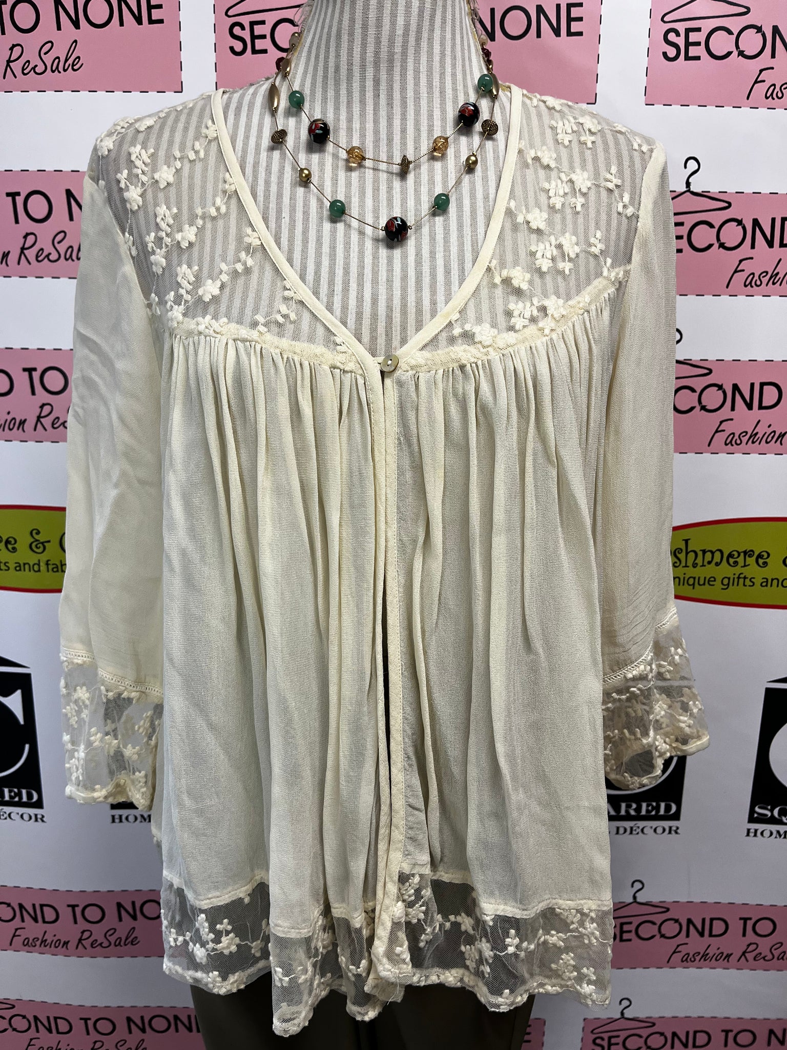 Effortless elegance in cream linen. This Charlie Paige peasant blouse features a single-button open front, flowing silhouette, and delicate lace accents along the neckline and cuffs. Three-quarter sleeves and lightweight fabric make it perfect for layering or wearing solo. A timeless vintage-inspired piece that transitions seamlessly from day to evening. Size not indicated but fits like a L.