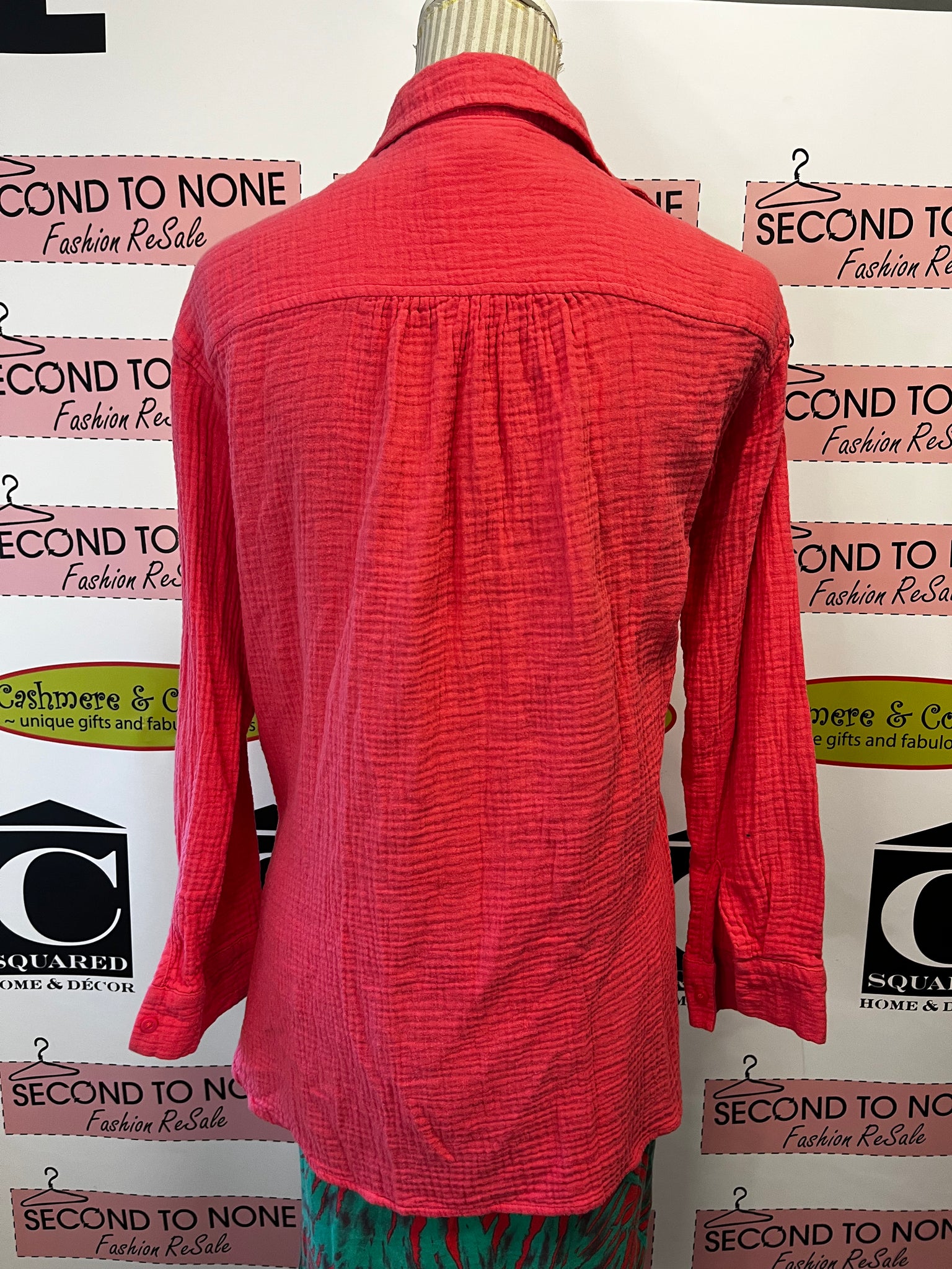 Effortless spring style meets pure fun in this coral crinkled shirt. Crafted from 100% cotton gauze for a naturally crinkled finish, it's the kind of piece that works overtime—layer it over your swimsuit for a breezy beach look, or button it up for something more polished. The vibrant coral hue brings instant personality to any outfit, while the long hemline and single chest pocket add practical charm. Lightweight, versatile, and unapologetically colorful, this is the go-to shirt that makes getting dressed feel like play. Additional button attached to inside tag. Brand: Rachel Roy. Size M.