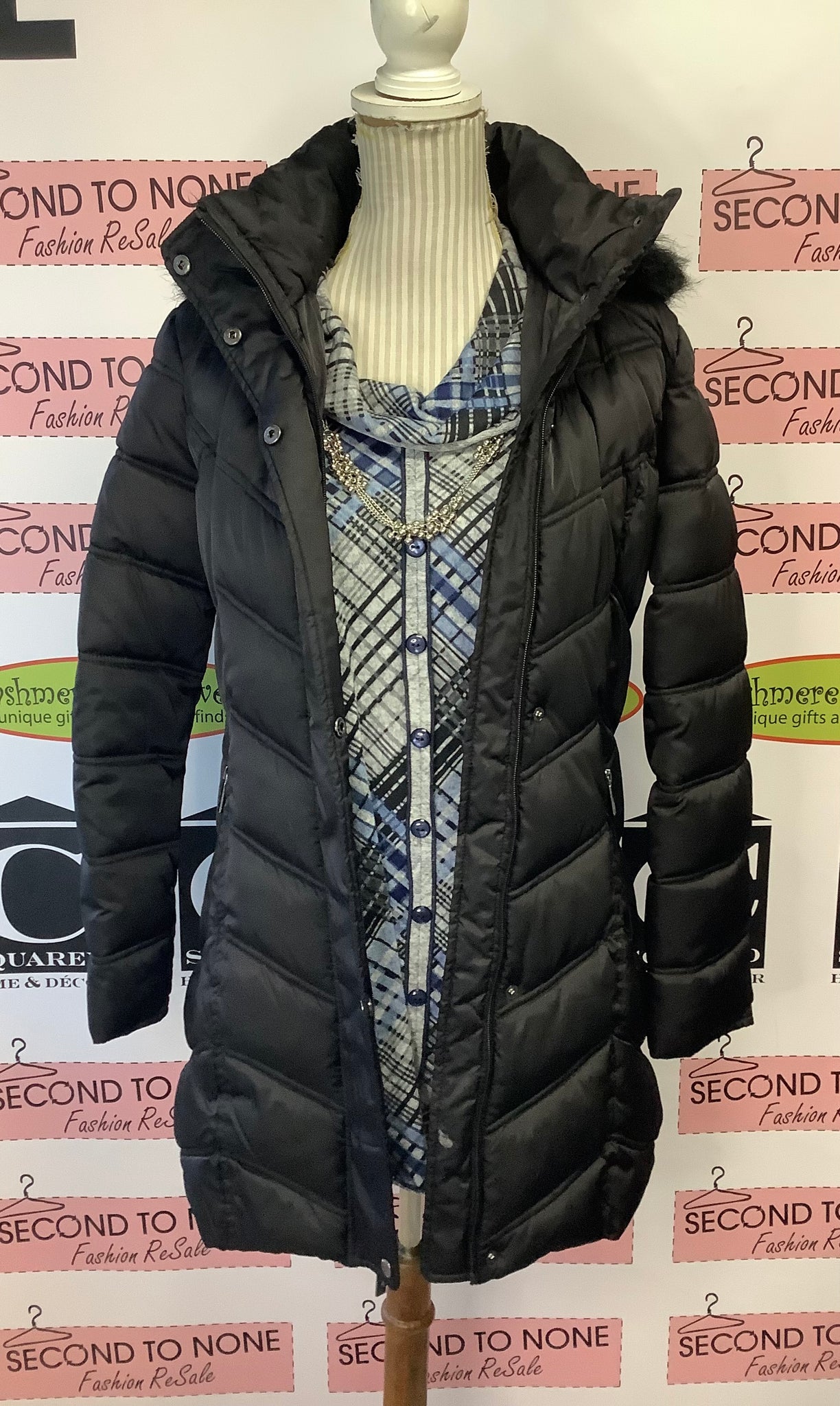 Embrace winter elegance with this Kenneth Cole puffy coat, a sophisticated choice for the season ahead. This extended-length jacket features a luxuriously faux fur-lined hood and a full-length zipper paired with decorative snap buttons down the front for refined detailing. Practical front zippered pockets keep essentials secure while you navigate the cold. In classic black, this piece transitions seamlessly from casual to polished occasions. In practically perfect condition, it's ready to pair beautifully with winter boots for a complete, curated look that captures the magic of the season.