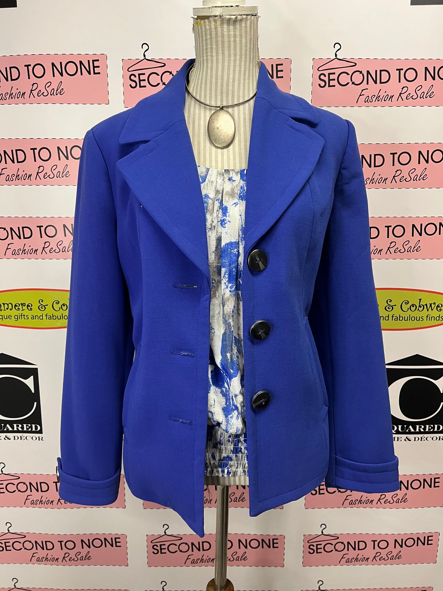 Elevate your wardrobe with this stunning Le Chateau blazer in rich royal blue. Tailored with a classic button-front closure and charming button accents adorning the cuffs, this piece strikes the perfect balance between polished and personality. The refined lapel collar adds a touch of sophistication that works beautifully for everything from boardroom meetings to brunch with friends. Versatile, chic, and ready to become your new go-to layer.