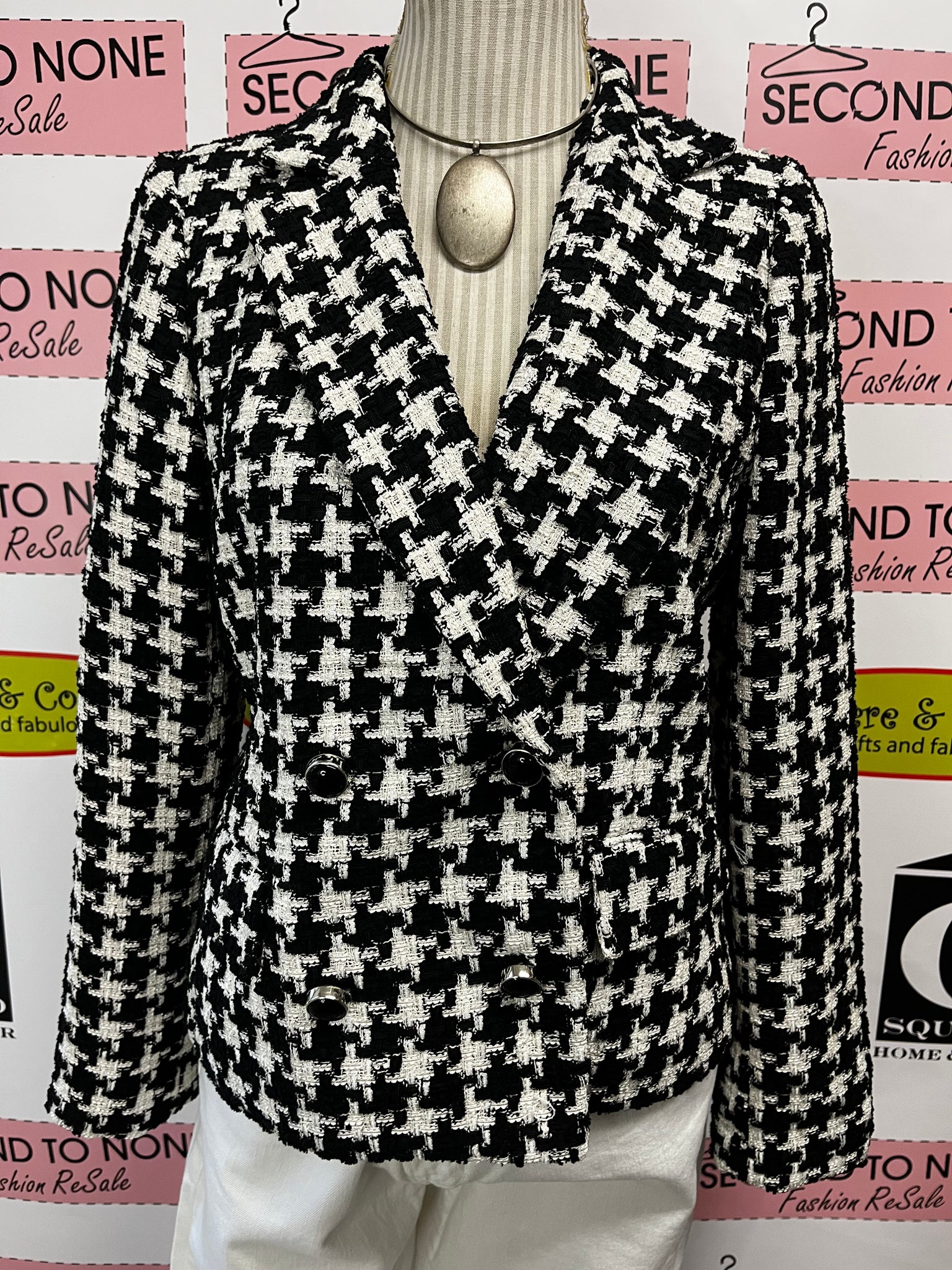 Timeless houndstooth meets modern versatility. This button-up blazer from Meg & Margot features a classic black and white pattern that transitions effortlessly from boardroom to brunch. Tailored for a polished silhouette, it layers beautifully over basics for business casual days or stands alone as a statement piece for elevated evenings. The structured fit and quality construction make it a wardrobe essential that works as hard as you do.