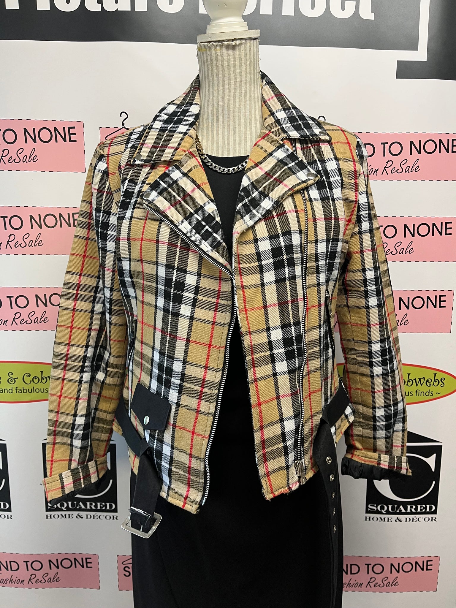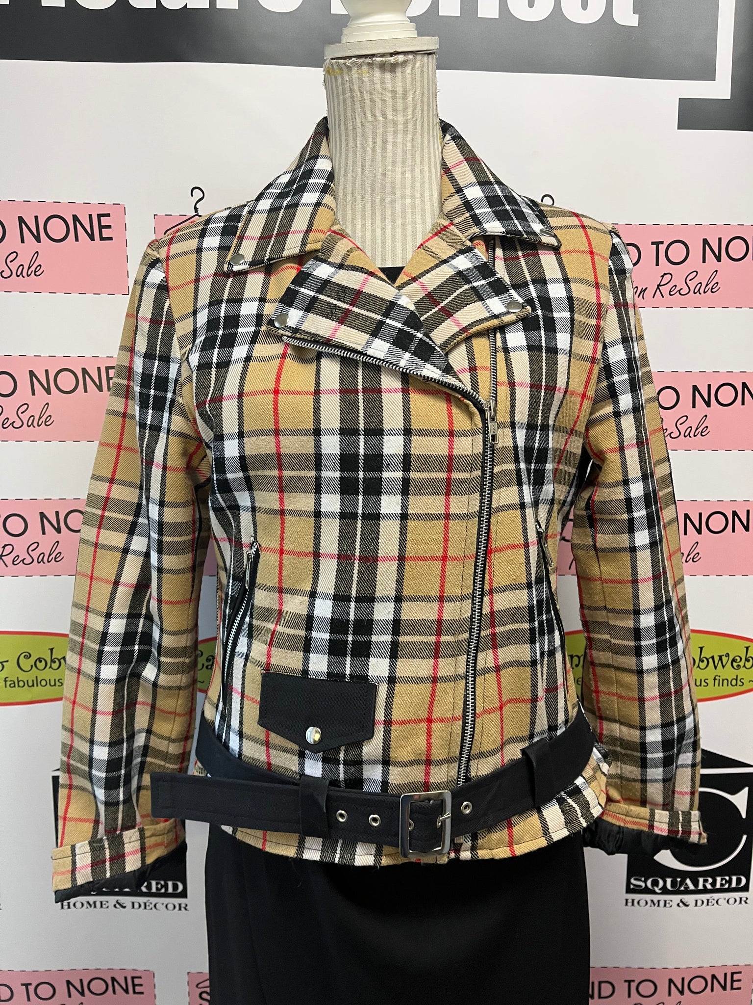Get ready to turn heads with the Patrick King Thompson Camel Plaid Biker Jacket! Featuring a timeless beige, white, black, and red plaid, this playful jacket rocks classic biker details like an over-center zipper, snap lapel accents, a belted waistline, and slick zipper pockets. Sized L but fits small, it’s perfect for adding a bold twist to your wardrobe while keeping things cozy and cool. Ride in style and let your jacket do the talking!
