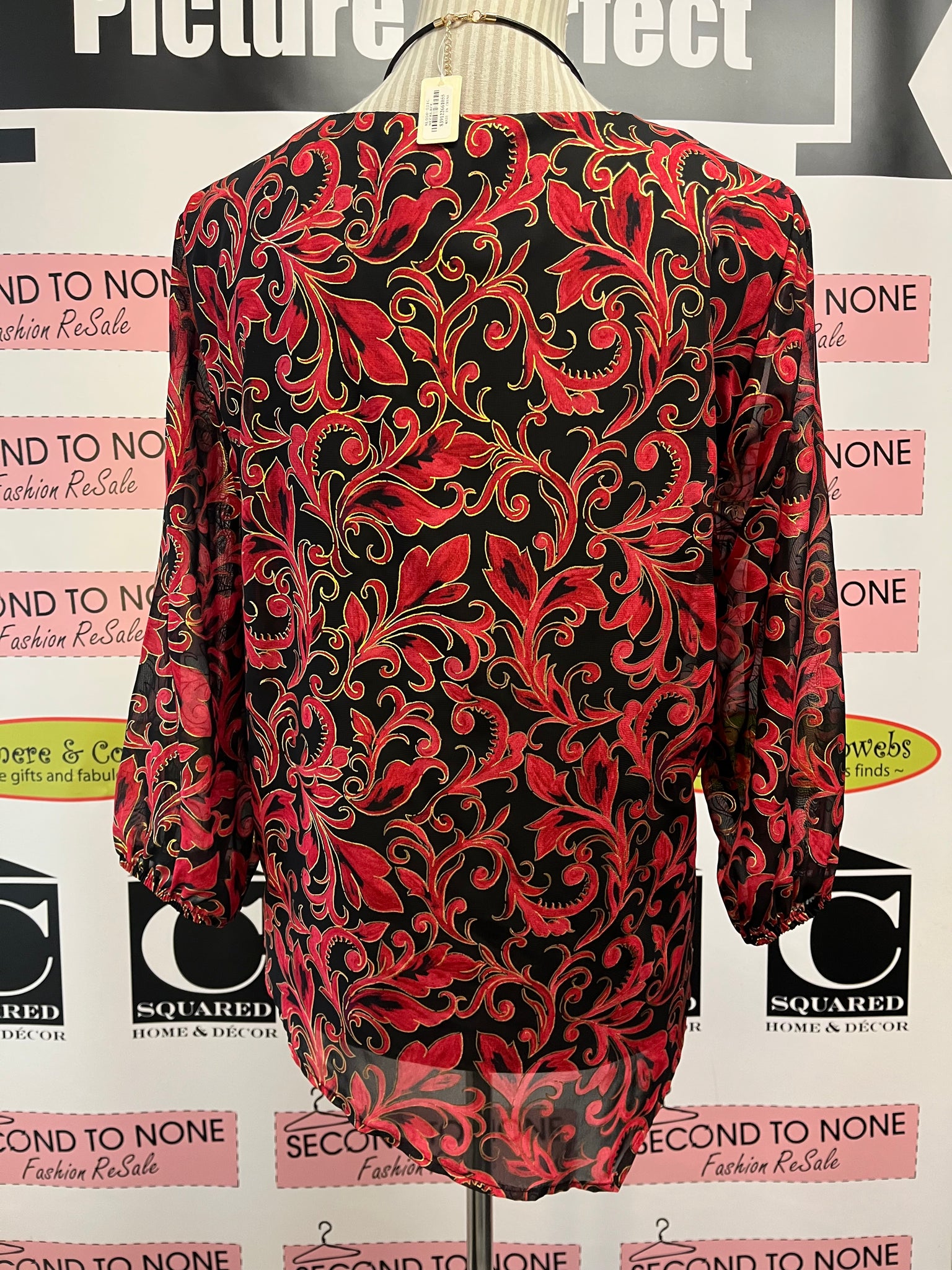 Red & Gold Print Sheer Sleeve Top (Size M)