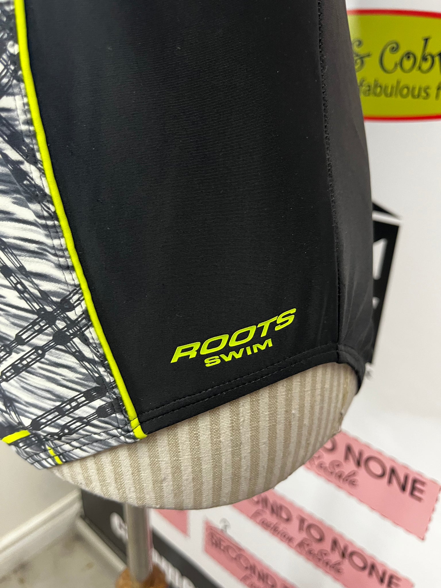 Dive into summer fun with this sporty one-piece bathing suit from Roots Swim. Featuring a bold black, white, and neon yellow color combo, its stretchy fabric ensures a flattering fit that moves with you. The open back adds a flirty touch while keeping things cool and comfortable. Perfect for poolside adventures or beach days, this suit blends style and performance effortlessly.