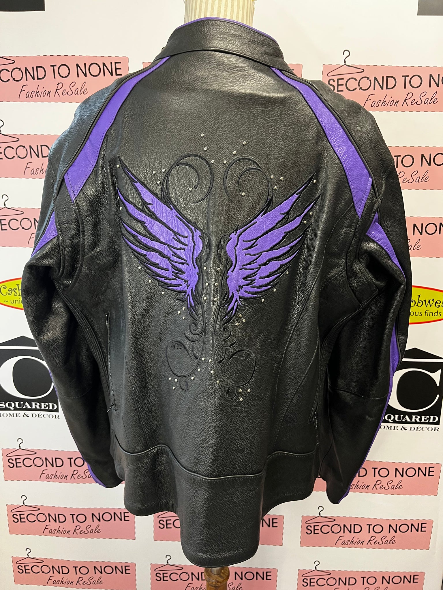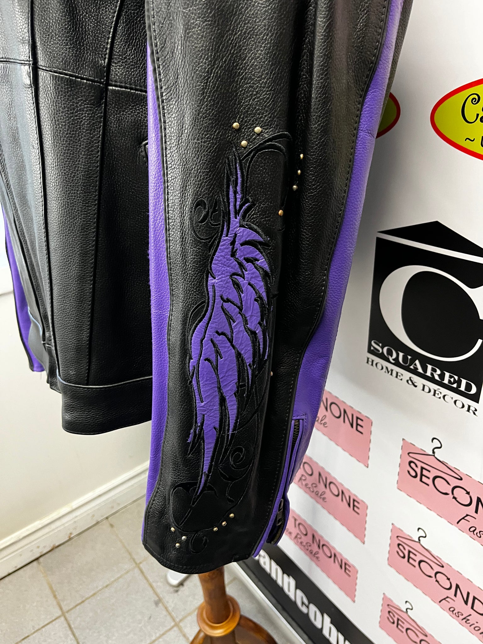 Stunning SanMarc leather motorcycle jacket in black and purple, brand new with tags attached. Features a zippered front closure and removable lining layer for versatile styling and comfort. Zippered sleeve cuffs provide adjustable fit, while intricate purple embroidered wing details on the sleeves and back add striking visual appeal. Premium leather construction built for durability and classic motorcycle style.