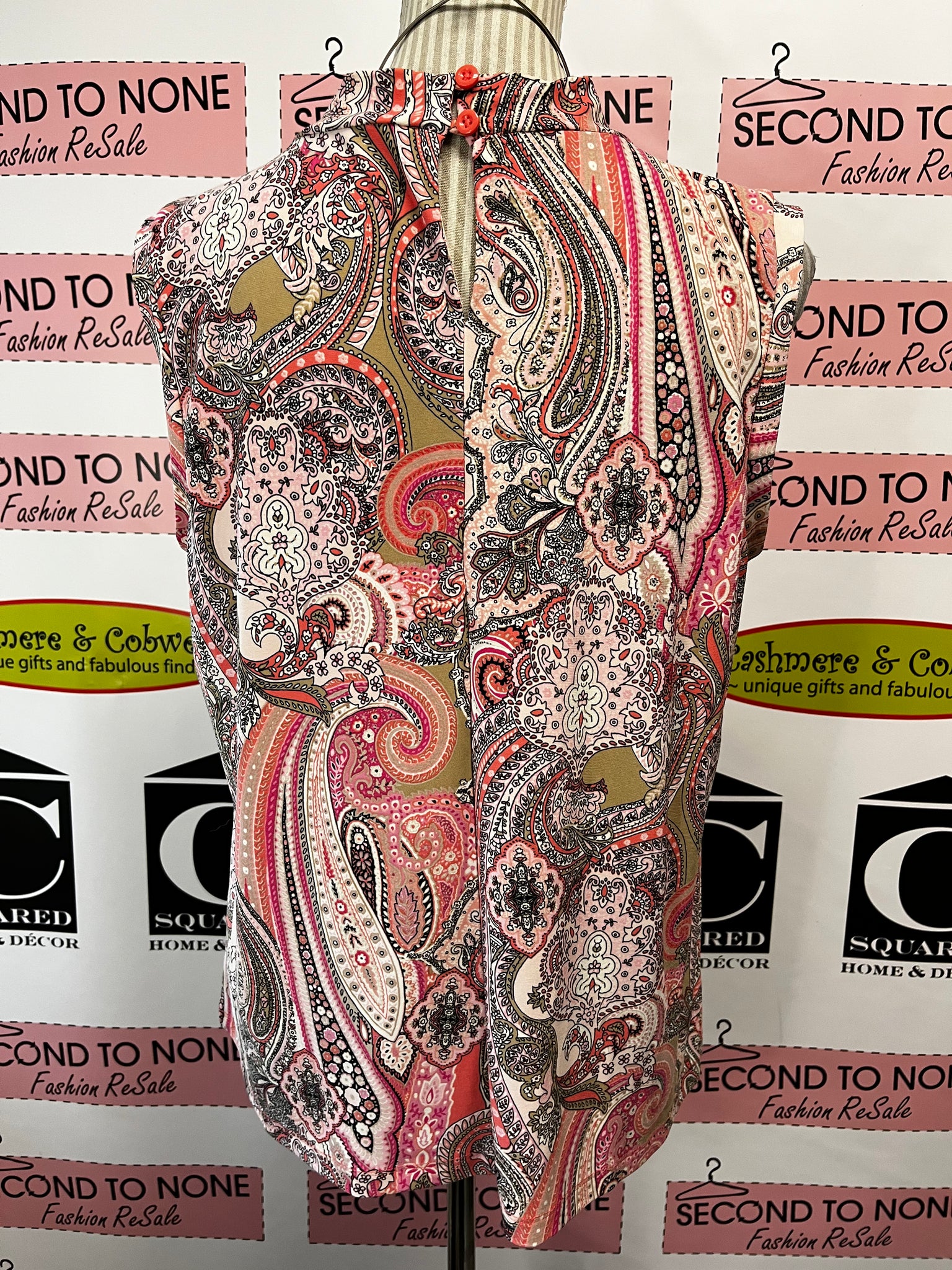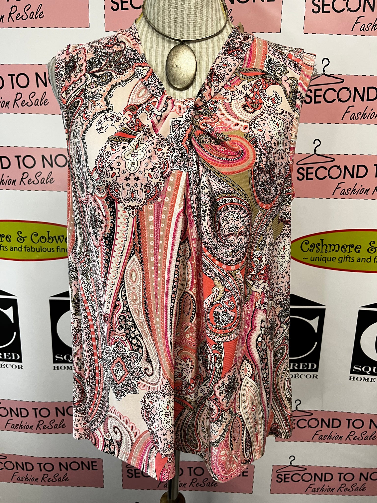 Add a splash of fun to your wardrobe with this Tommy Hilfiger tank top. Featuring a playful paisley pattern in charming shades of pink, its twisted neckline adds a flirty twist to your look. Perfect for sunny days or layering, this size XL piece blends comfort with signature style effortlessly.