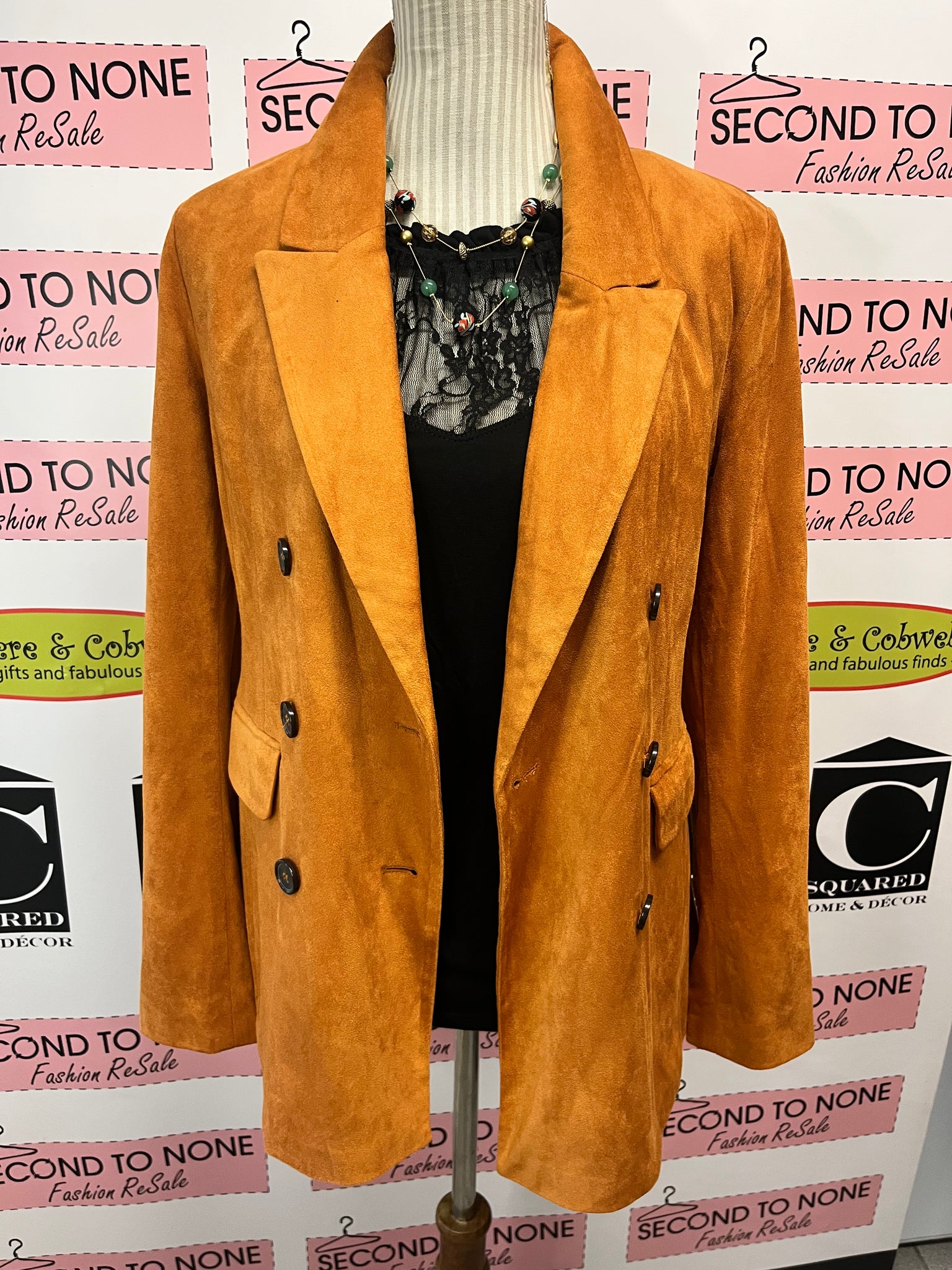 Introducing our Bagatelle Burnt Orange Jacket, a luxurious addition to your fall wardrobe. Crafted with a super soft, suede-like finish and adorned with brown and black printed buttons, this double breasted jacket will elevate any outfit. Its classic silhouette, shoulder pads, and slight stretch ensure a flattering shape. Perfect for work or running errands, this jacket exudes elegance and sophistication. Step into fall with style. Size S.