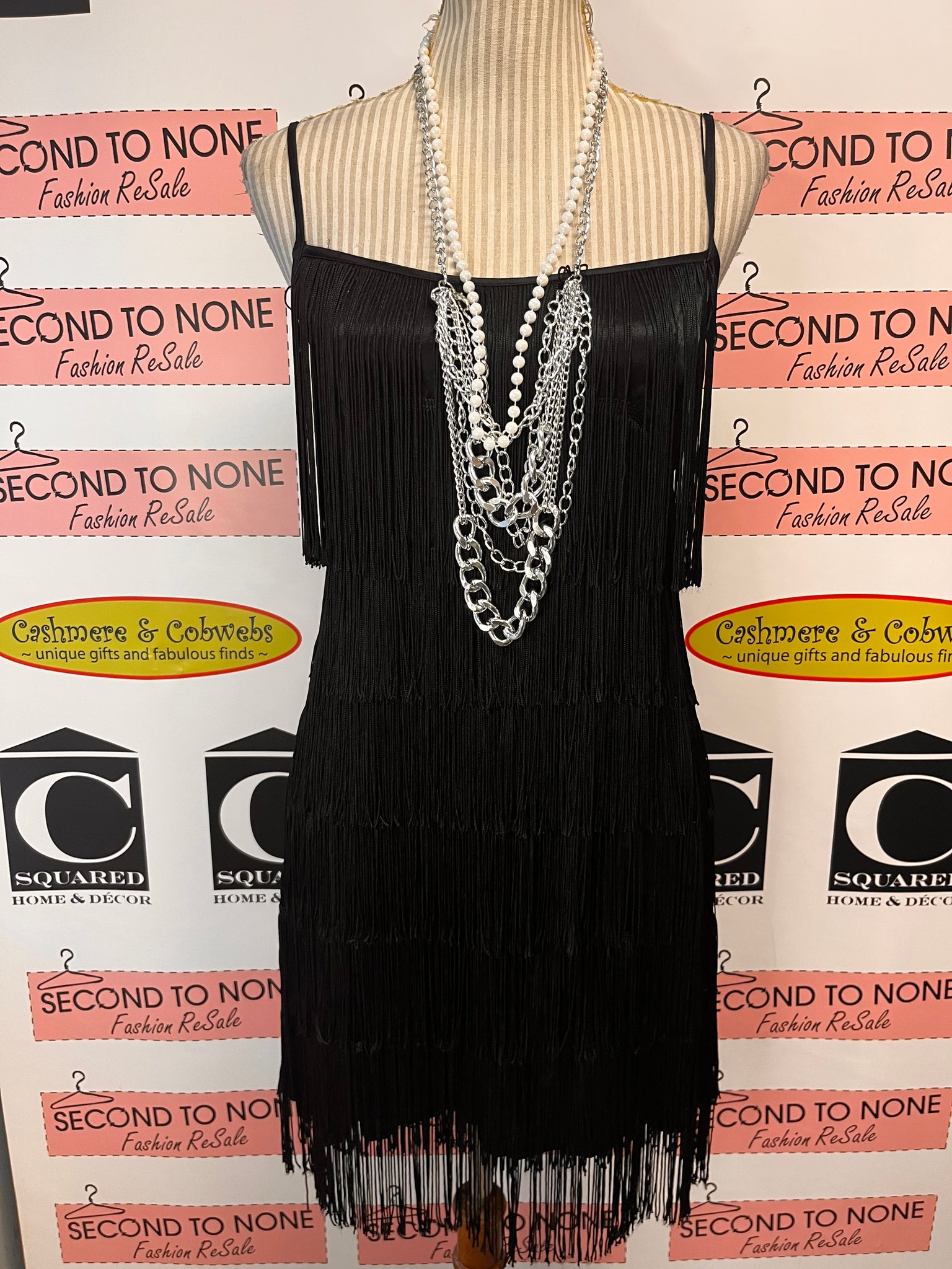 Step into the spotlight with this show-stopping black flapper dress that channels pure 1920s glamour. Cascading tiers of fringe create mesmerizing movement with every twirl, while delicate thin straps keep the focus on the drama below. A hidden side zipper ensures a seamless silhouette, perfect for dancing the night away like a true Great Gatsby icon. This mini dress captures the hottest trend right now—fringe is everywhere—making it your ticket to vintage-inspired elegance and unforgettable nights. Size 10.