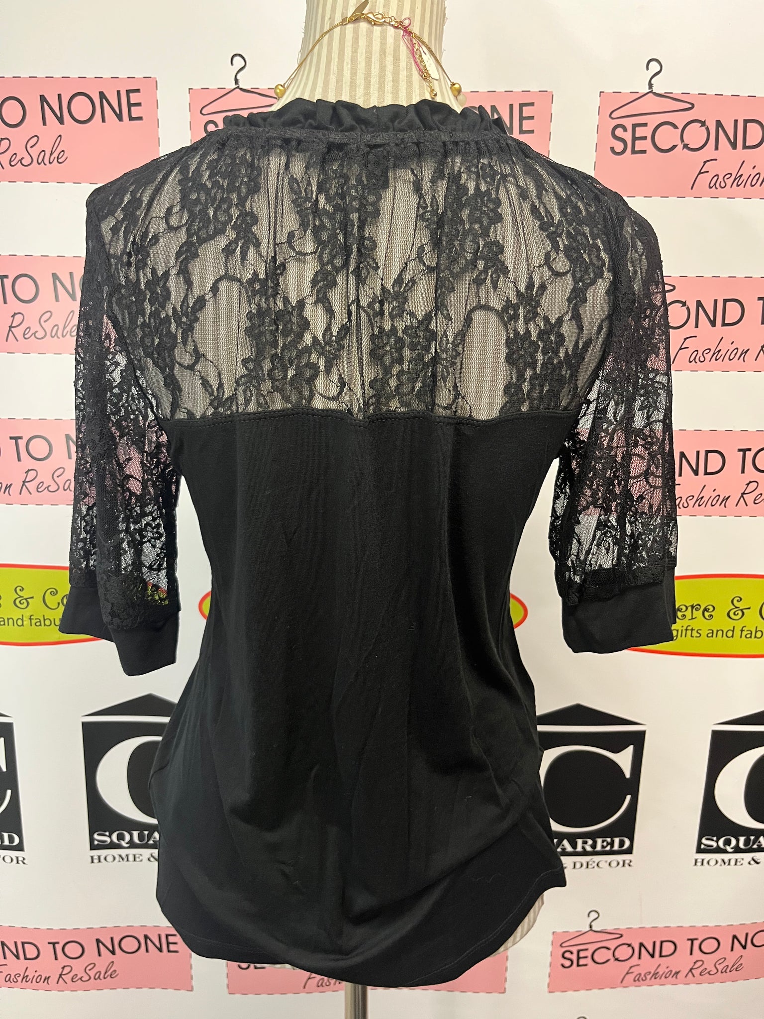 Elevate your wardrobe with our Black Half Lace T-Shirt. The high neckline with a frilly collar gives an elevated feel, while the sheer lace sweetheart neckline and fabric cuff on the short sleeves give unique touches of practicality and femininity. Made with soft and stretchy fabric, it's the perfect layering choice for colder months. Experience the luxury of an elevated basic. Brand: Storm Los Angeles. Size L.