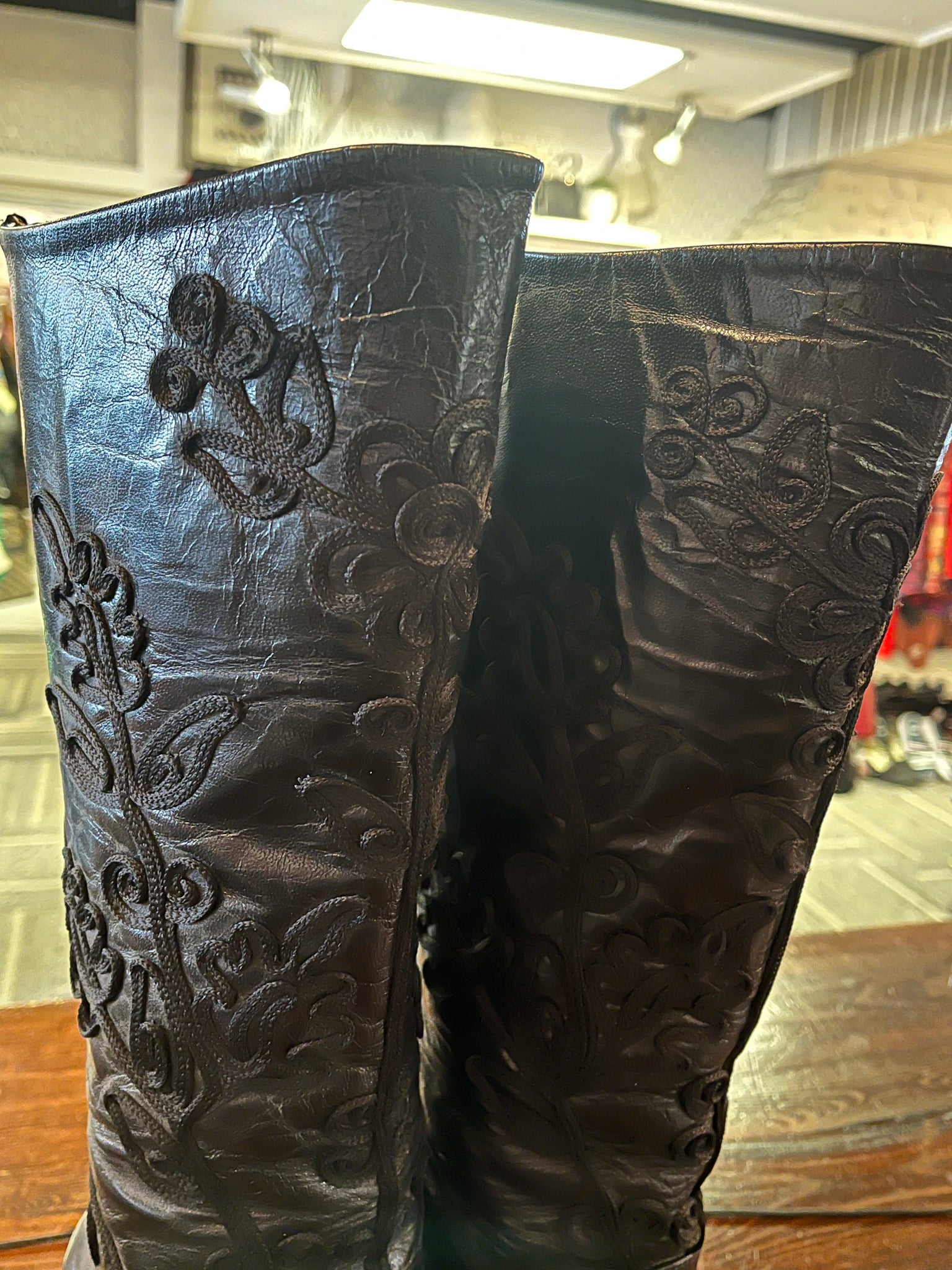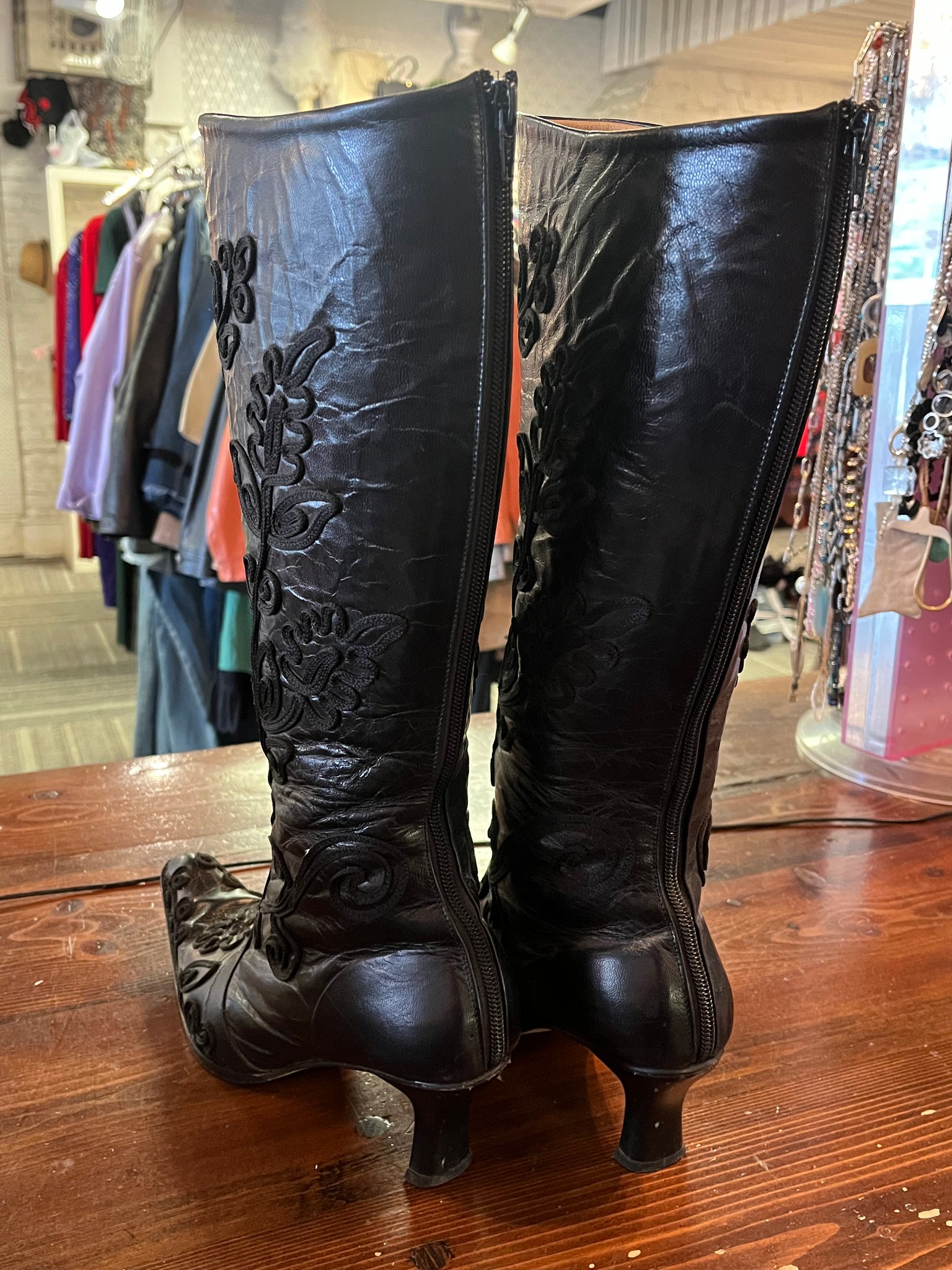 Meet your new obsession: black leather boots that refuse to blend in. Crafted with meticulous attention to detail, these beauties showcase an intricate embroidered ribbon pattern that dances across supple leather. The pointed toe keeps things sharp, while the modest heel strikes that perfect balance between comfort and sass. Zip up the back and you're ready to turn heads—whether you're conquering the office or owning the night out.