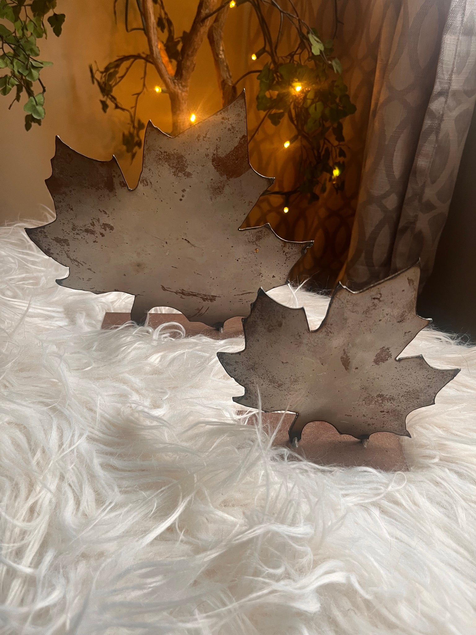 Celebrate your Canadian roots with this striking set of two locally crafted steel maple leaves. Hand-cut from thick, durable steel and finished with an authentic rusted patina, these pieces bring industrial charm and patriotic flair to any room. Display them on a shelf, mantel, or wall to add character and conversation-starting style. The distressed aesthetic works seamlessly with modern, rustic, farmhouse, or eclectic décor schemes. Perfect for the proud Canadian who appreciates artisan-made home accents with real substance. Large measures 9" square/Small measures 6" square.